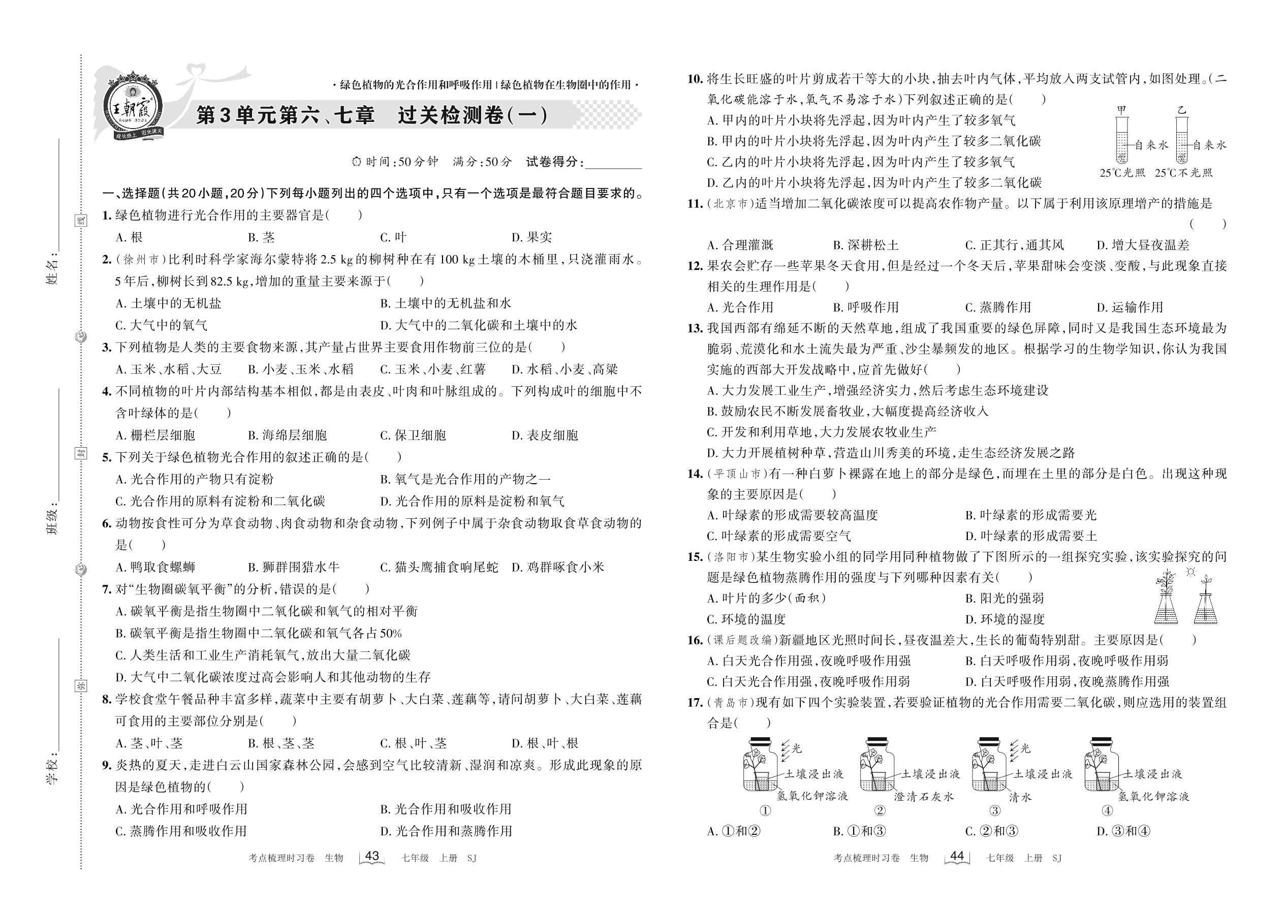 2022上册七年级生物苏教版 第3单元第六、七章 过关检测卷(一)