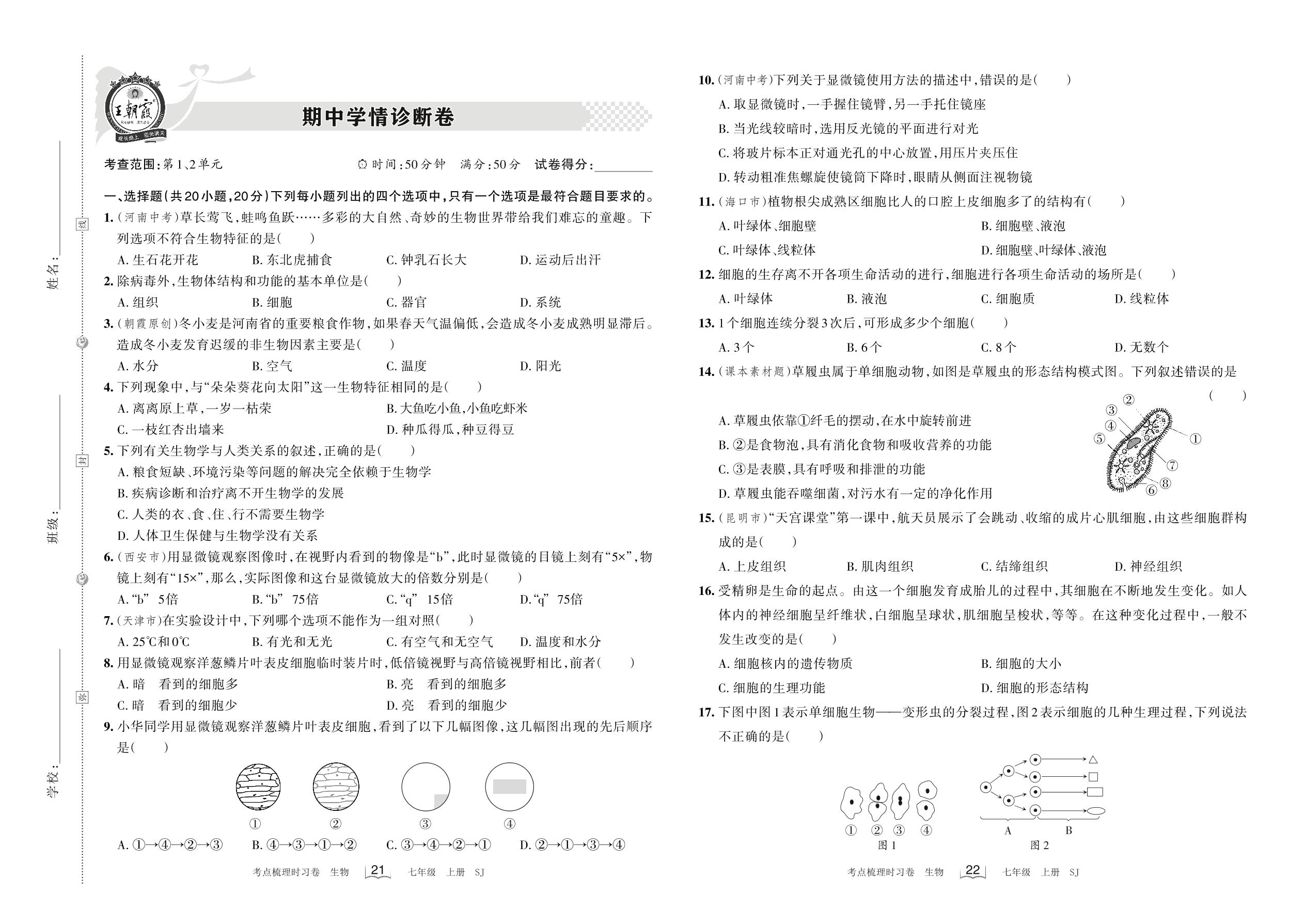 七年级生物苏教版上册期中卷
