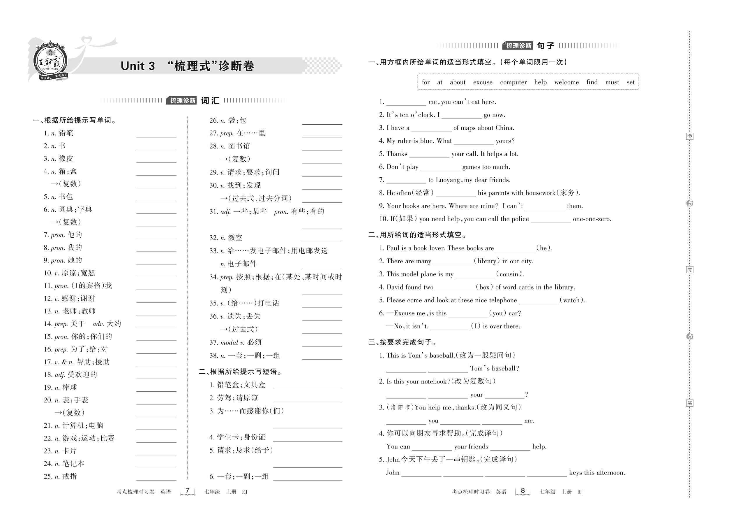 2022上册七年级英语人教版 Unit 3 “梳理式”诊断卷_R220818090557073