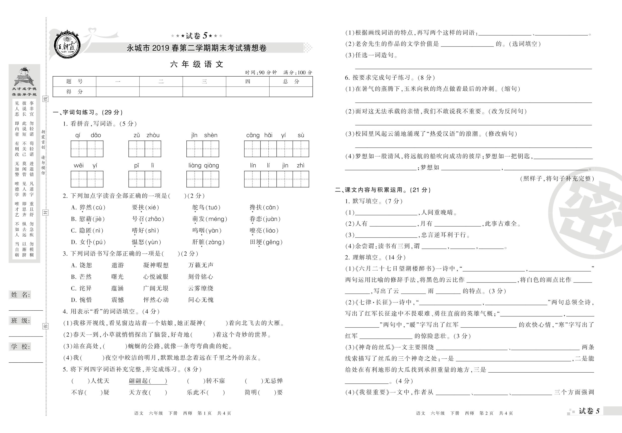 2018-2019学年第二学期永城市猜想卷六年级语文试卷(西师版)【5】