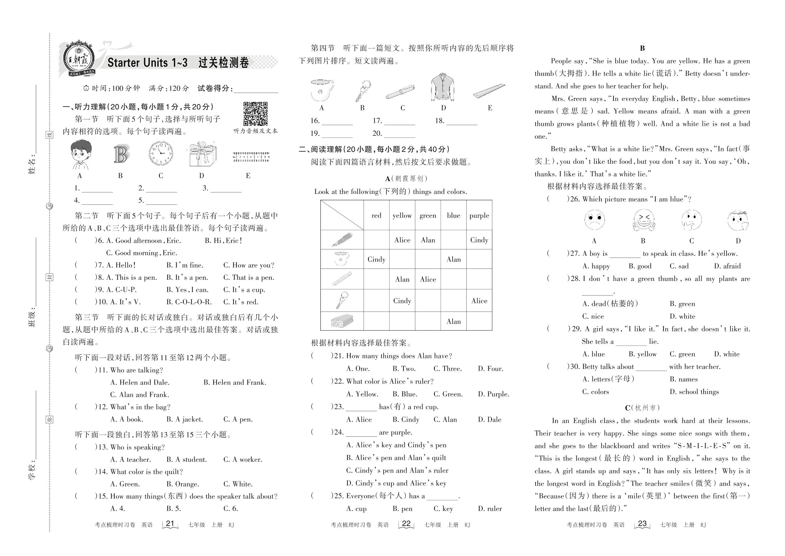 2022上册七年级英语人教版 Starter Units 1~3 过关检测卷_R220818090600487