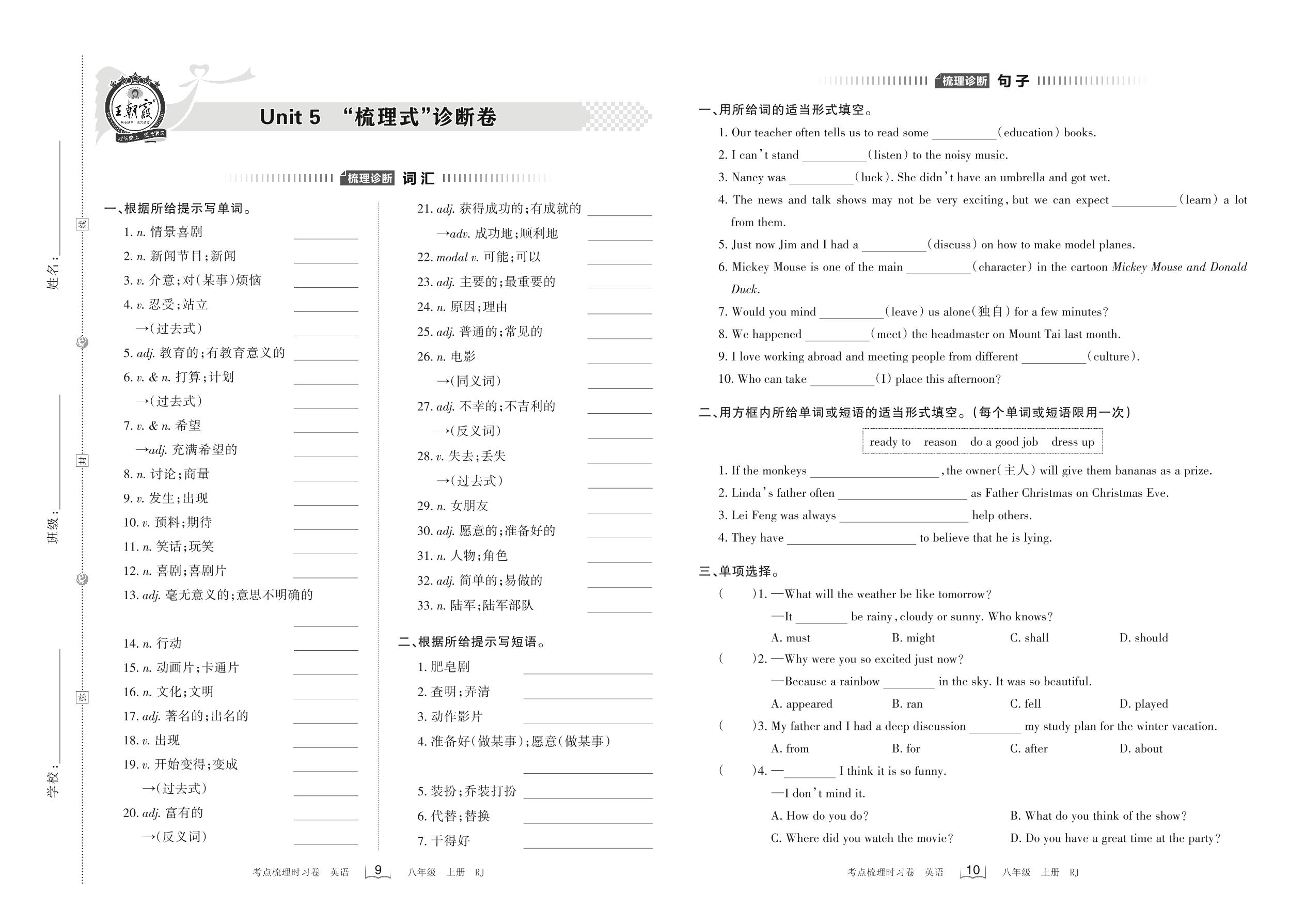 2022上册八年级英语人教版 Unit 5 “梳理式”诊断卷_R220818091636003