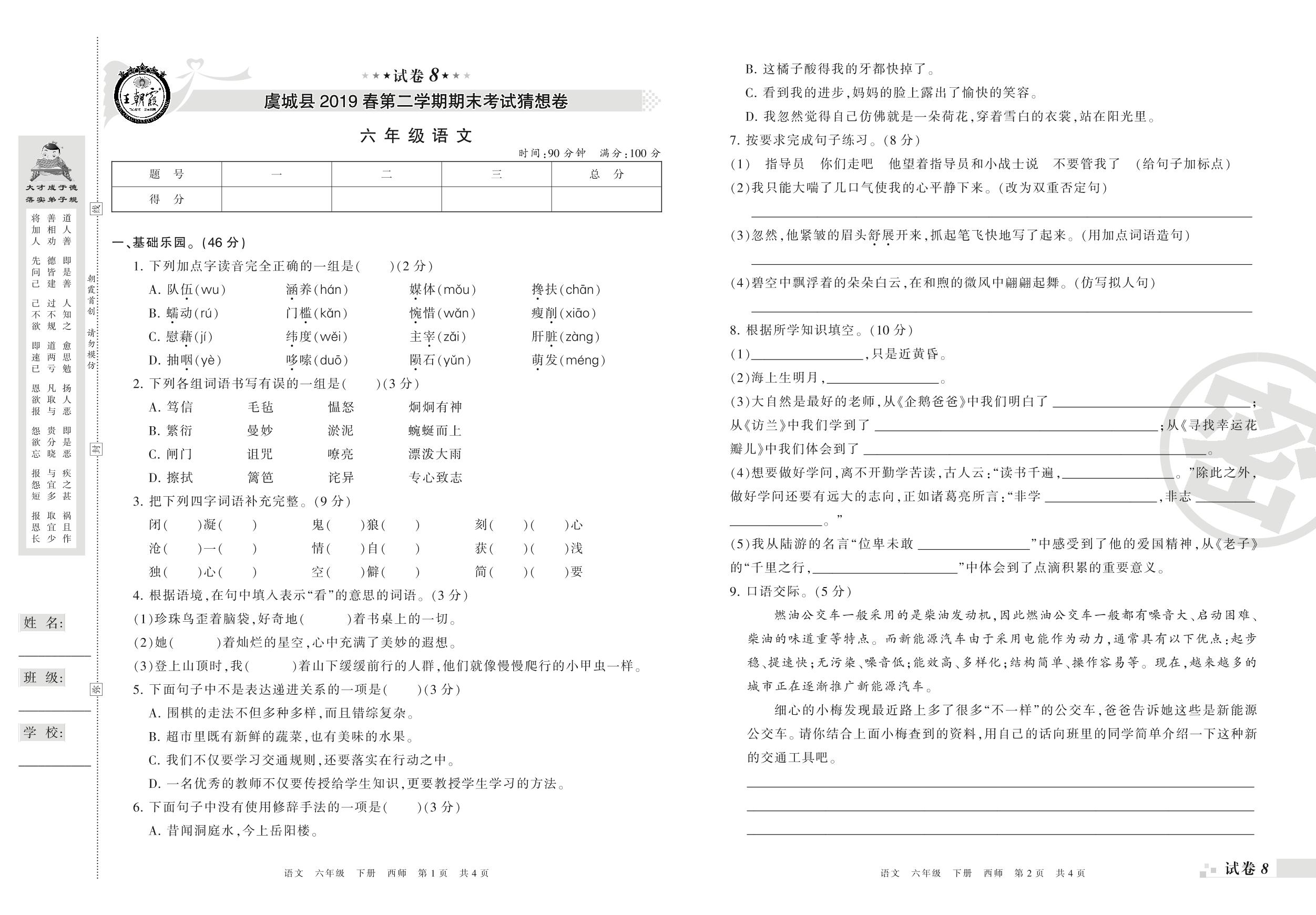 2018-2019学年第二学期商丘市虞城县猜想卷六年级语文试卷(西师版)【8】
