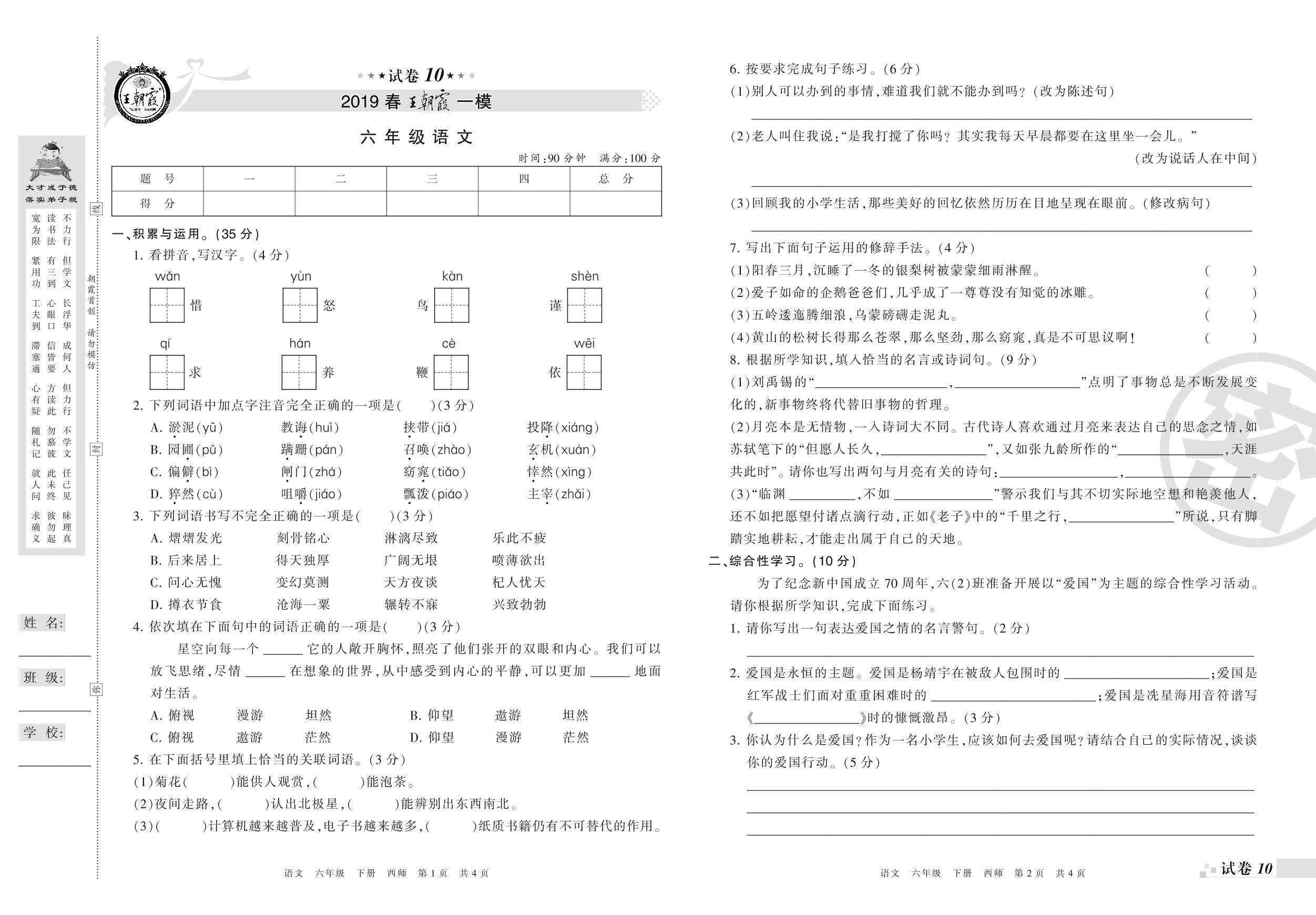 王朝霞期末模拟卷六年级下册语文(西师版)【10】