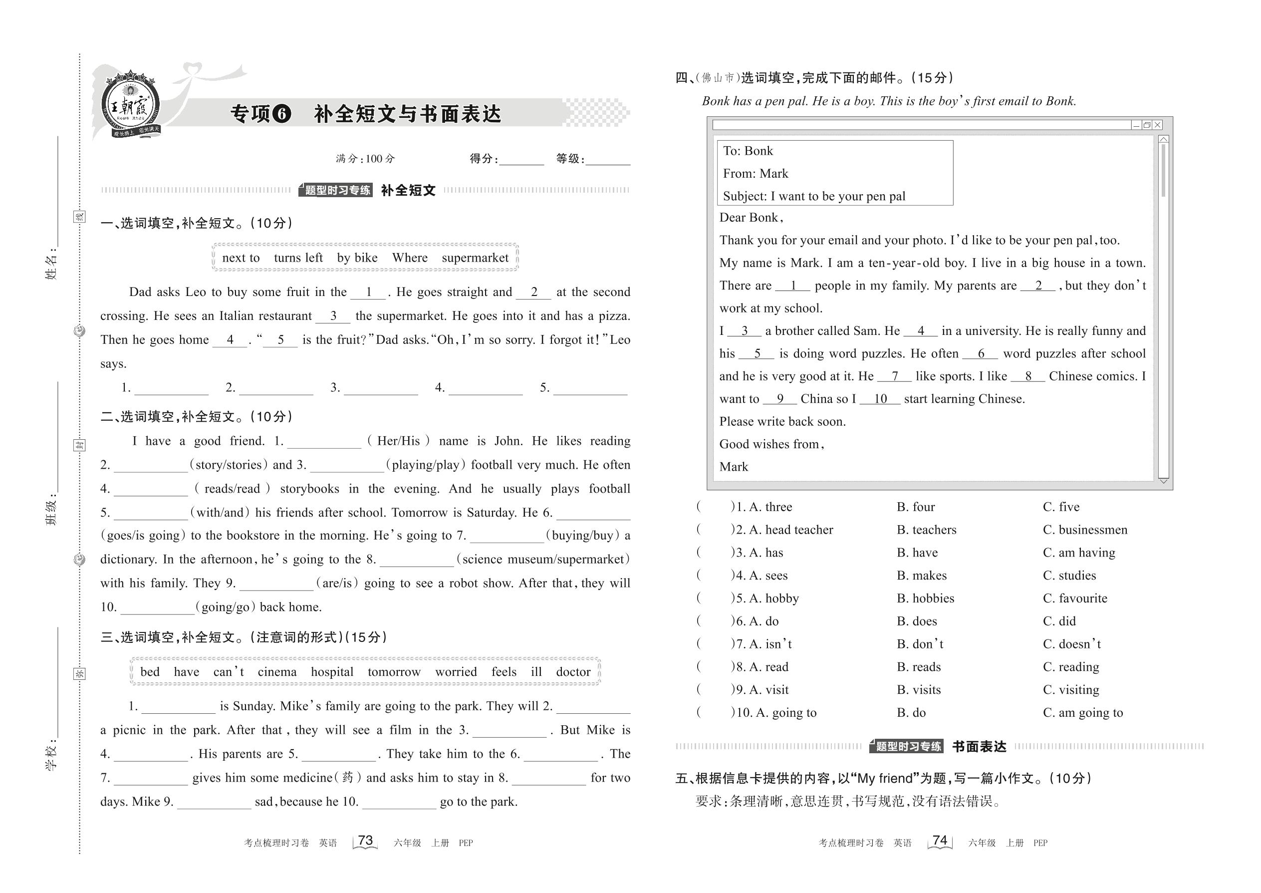 2022上册六年级英语人教PEP版 专项6 补全短文与书面表达