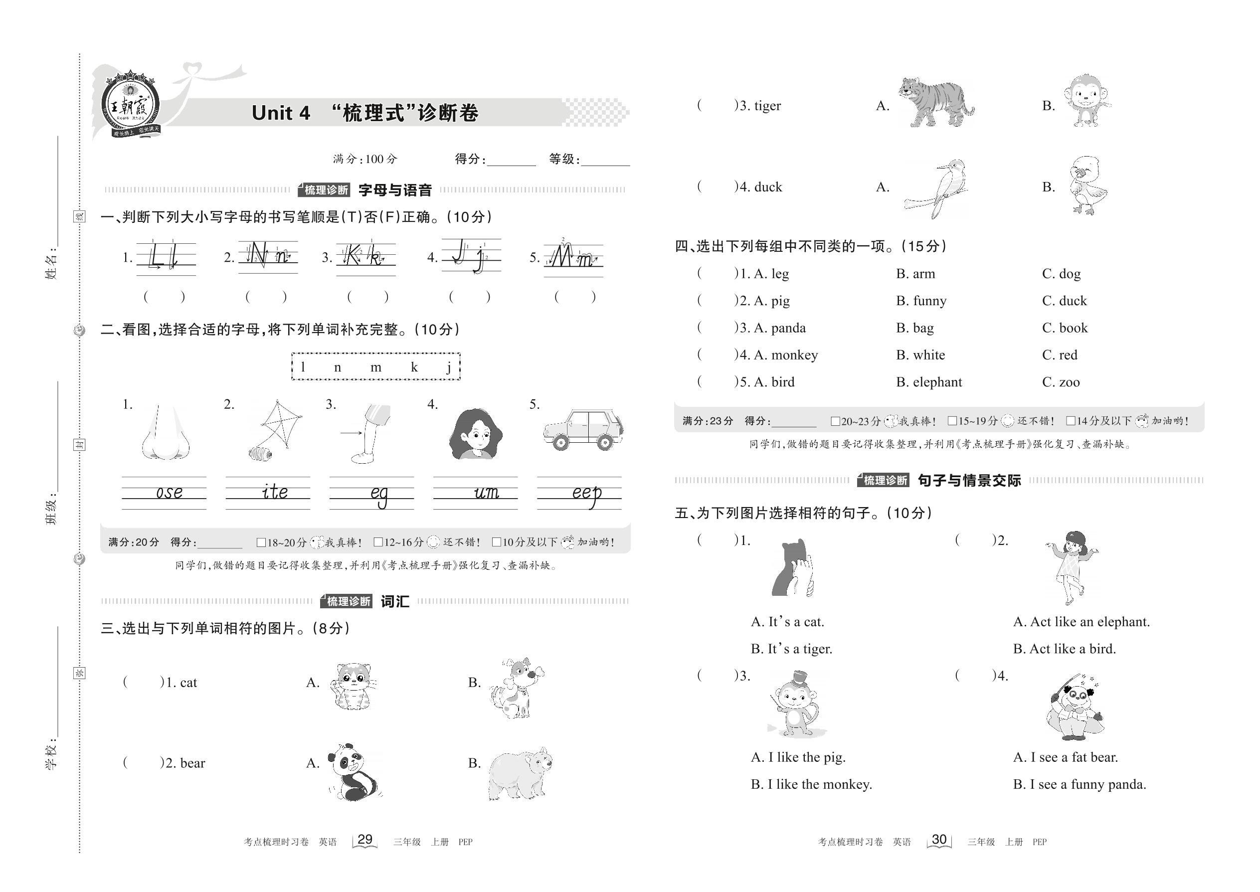2022上册三年级英语人教PEP版 Unit 4 “梳理式”诊断卷