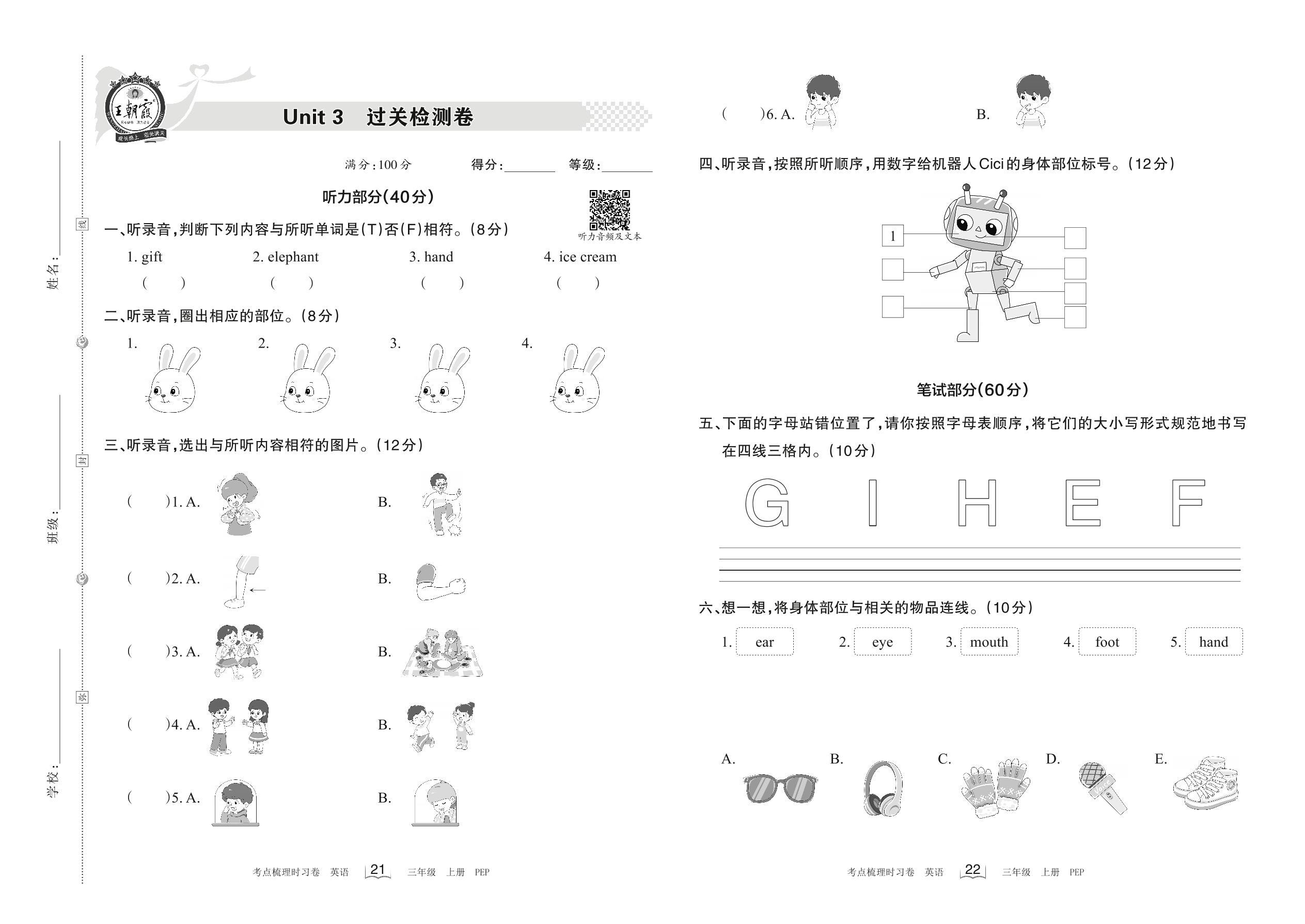 2022上册三年级英语人教PEP版 Unit 3 过关检测卷