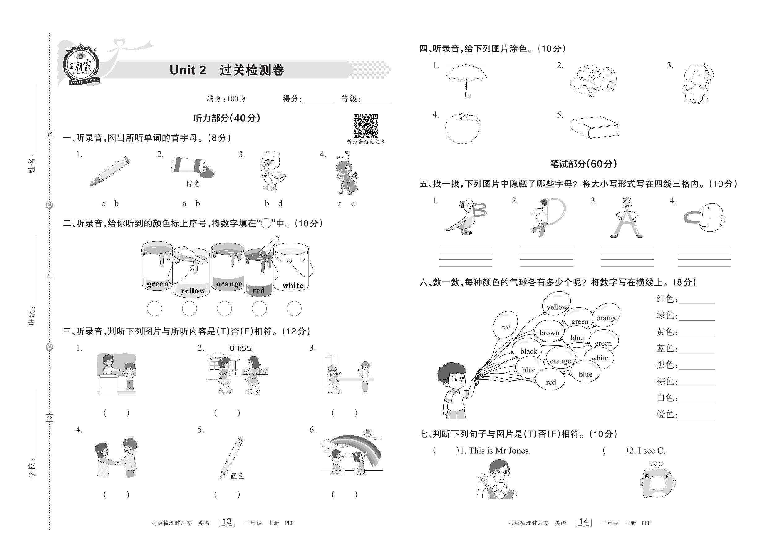 2022上册三年级英语人教PEP版 Unit 2 过关检测卷