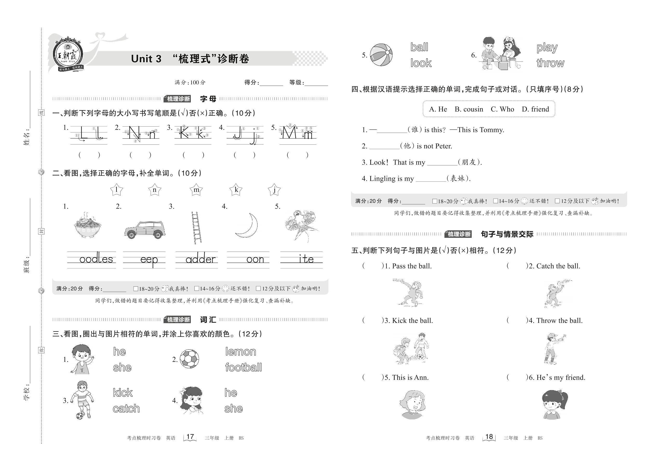 2022上册三年级英语北师版 Unit 3 “梳理式”诊断卷
