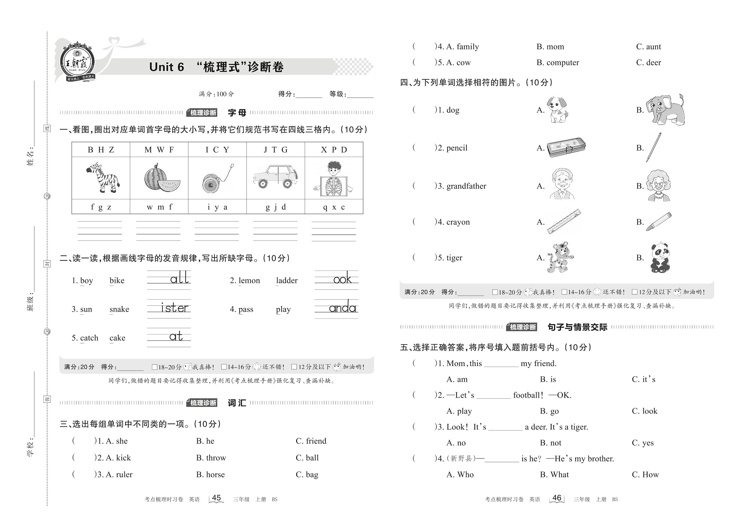 2022上册三年级英语北师版 Unit 6 “梳理式”诊断卷