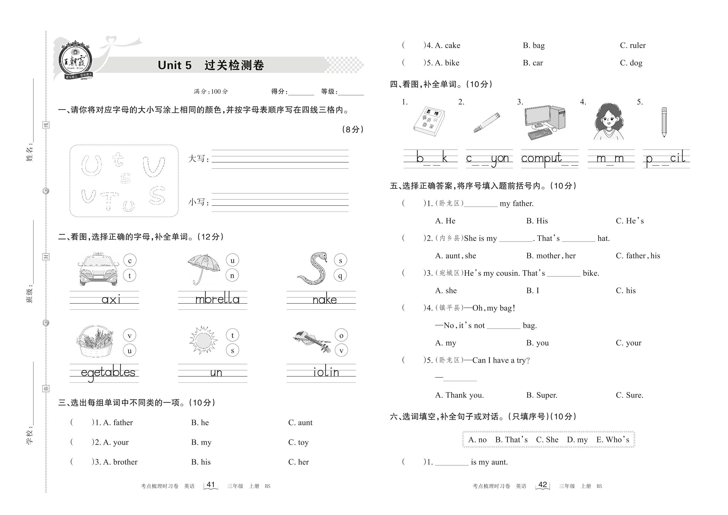 2022上册三年级英语北师版 Unit 5 过关检测卷