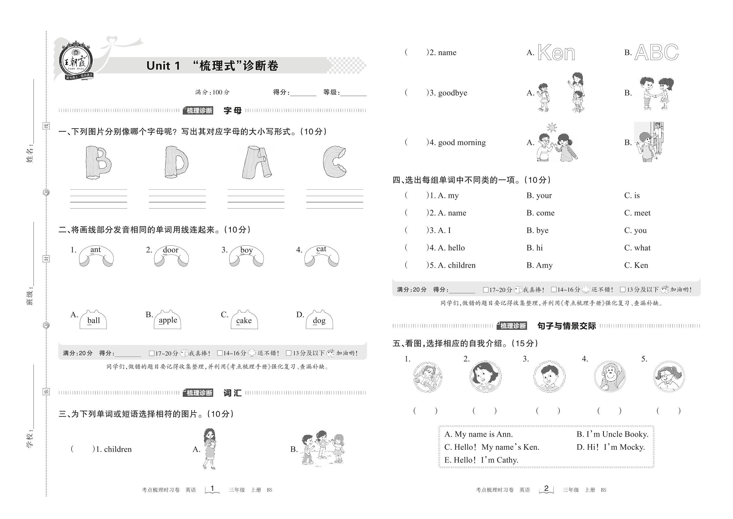 2022上册三年级英语北师版 Unit 1 “梳理式”诊断卷
