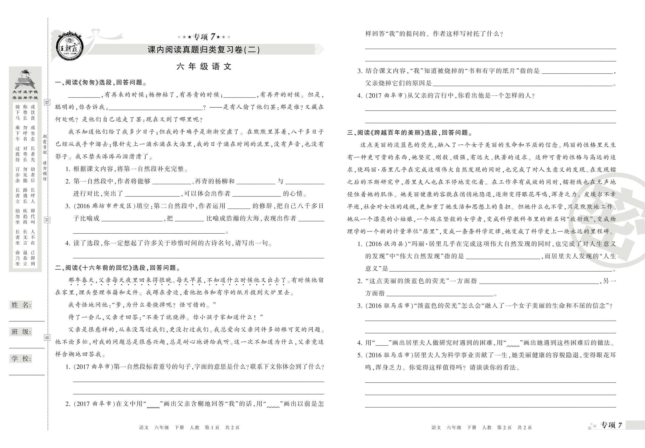 王朝霞期末专项卷——课内阅读(二)、课外阅读与写作真题归类复习卷六年级下册语文(人教版)_R21080243110【0】