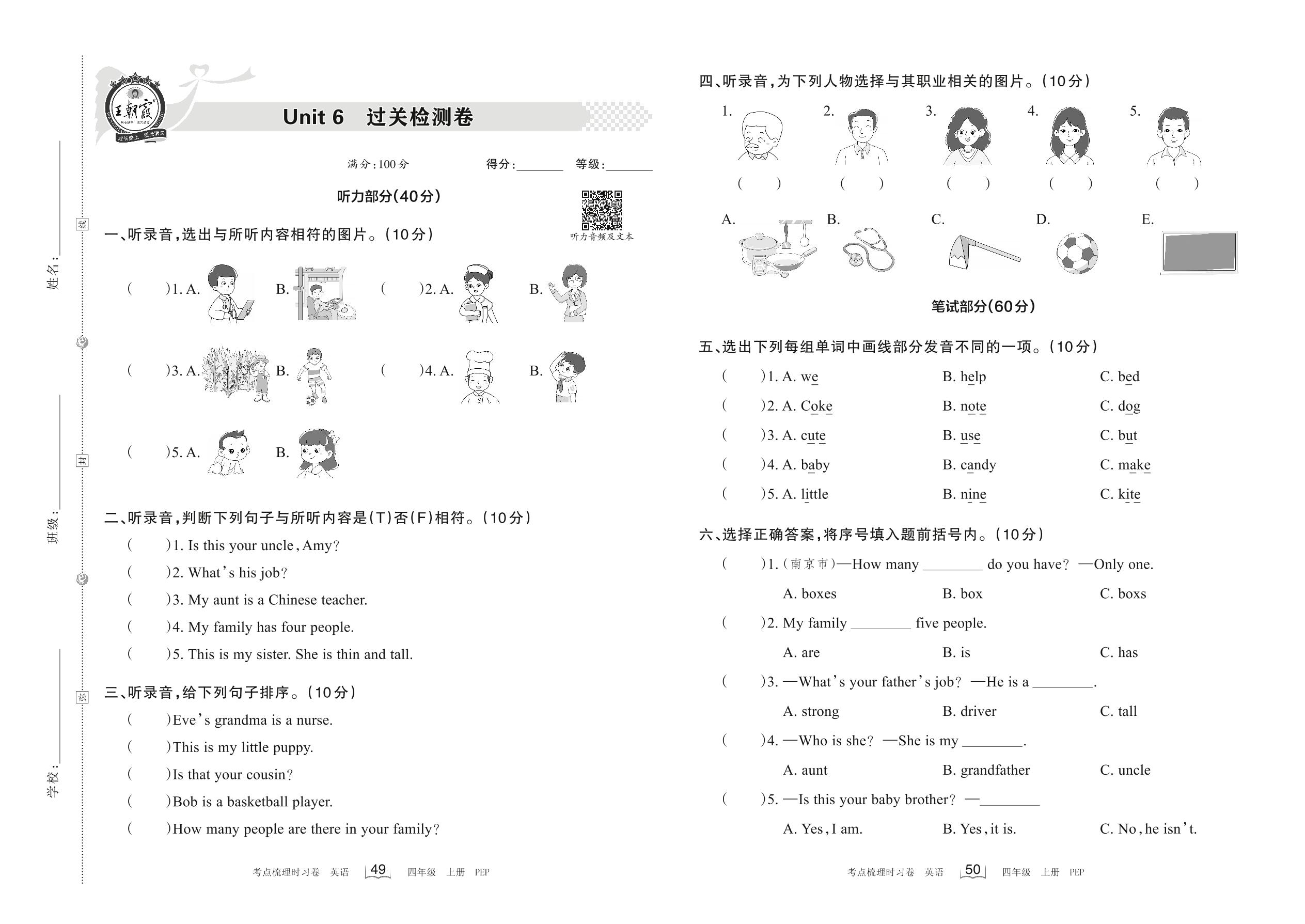 2022上册四年级英语人教PEP版 Unit 6 过关检测卷