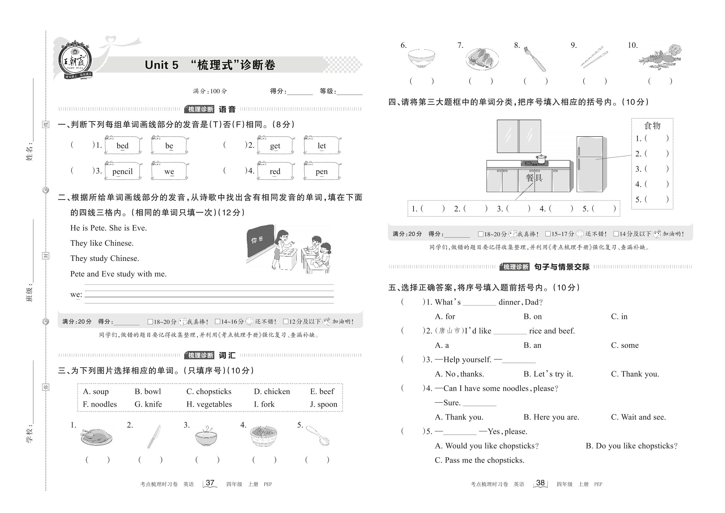 2022上册四年级英语人教PEP版 Unit 5 “梳理式”诊断卷