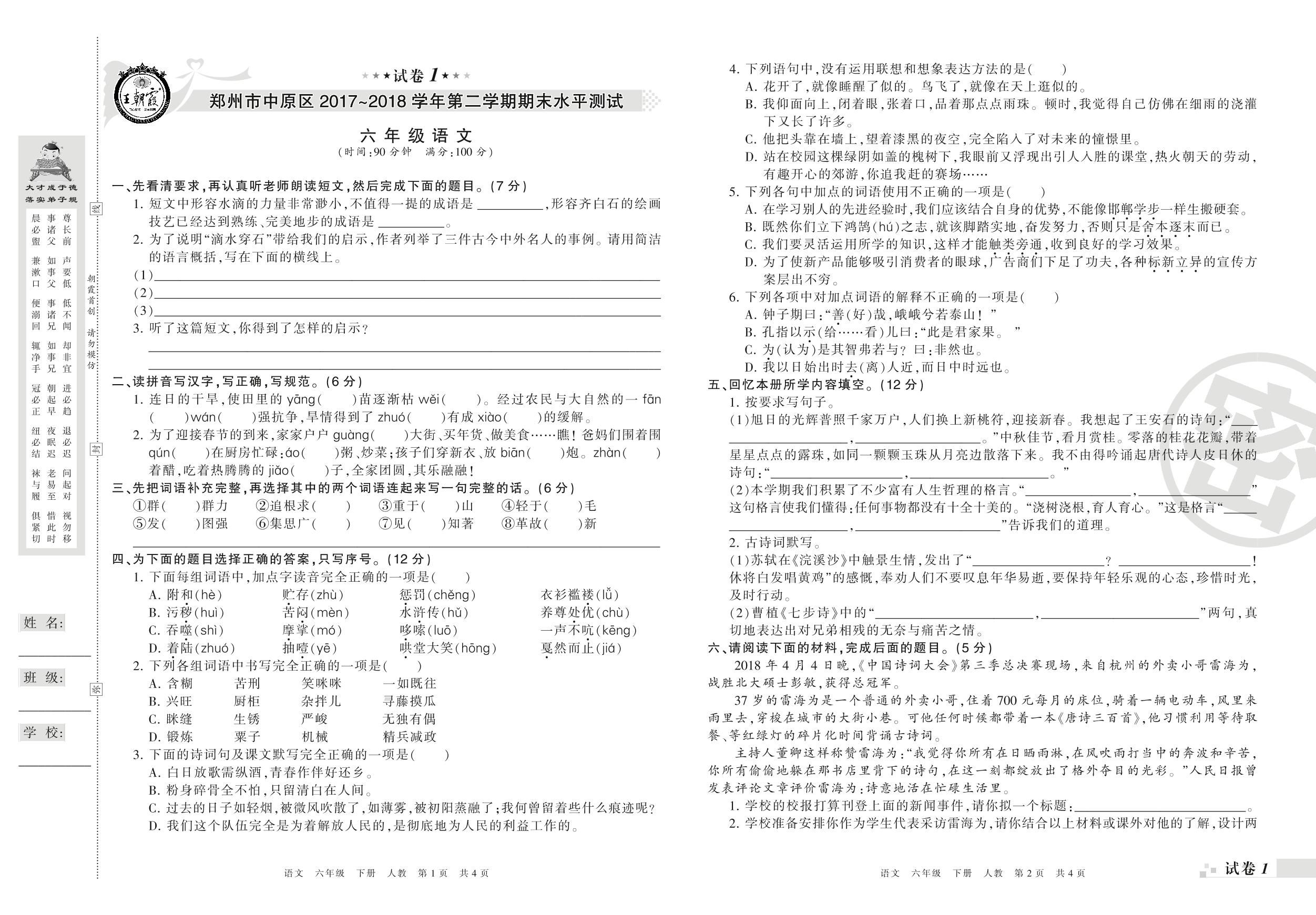2017-2018学年第二学期郑州市中原区六年级语文试卷(人教版)_R21080243115【1】