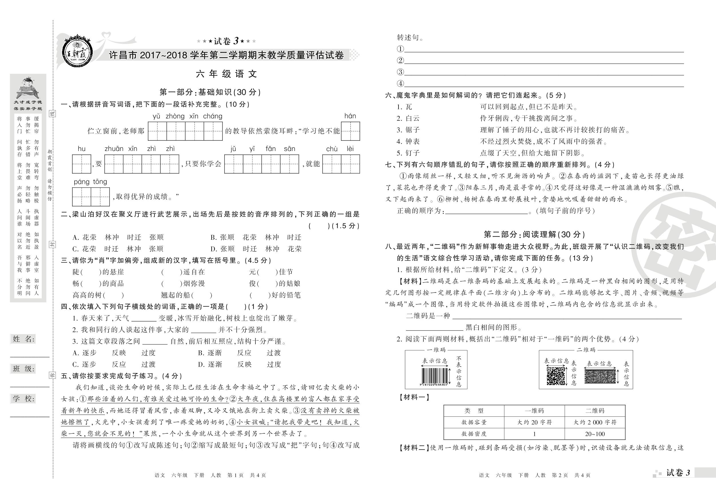 2017-2018学年第二学期许昌市六年级语文试卷(人教版)【3】