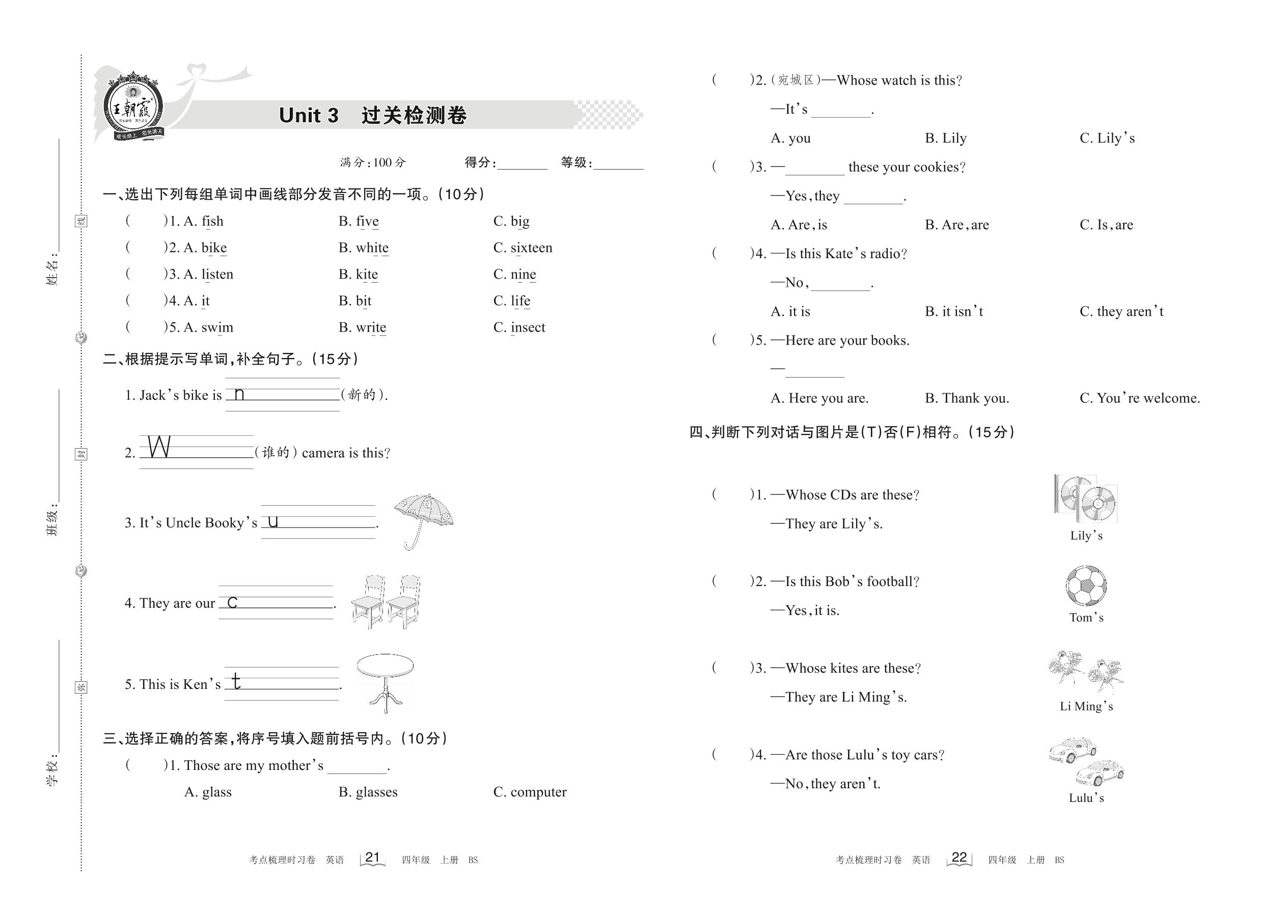 四年级英语北师版上册单元卷