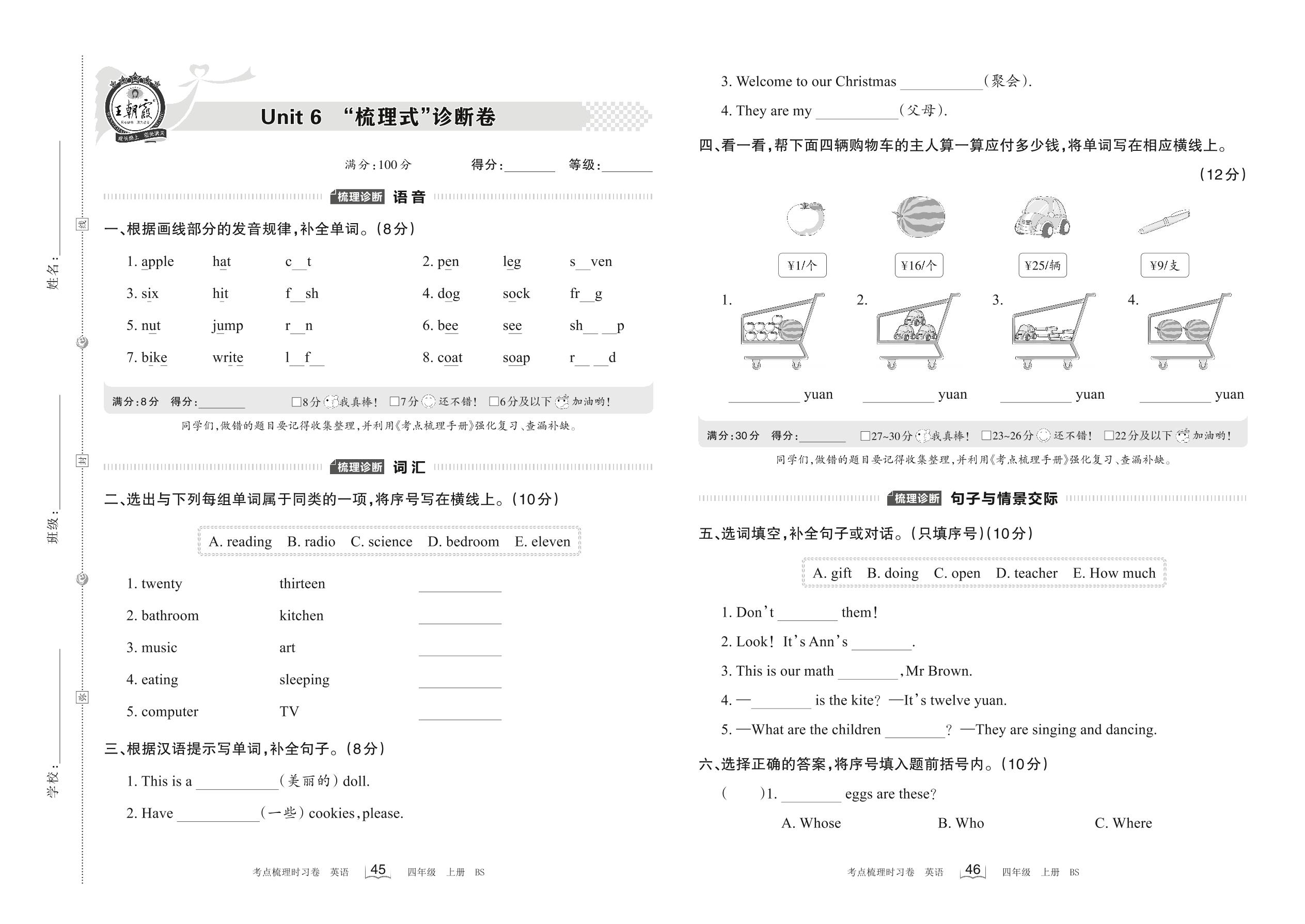 2022上册四年级英语北师版 Unit 6 “梳理式”诊断卷