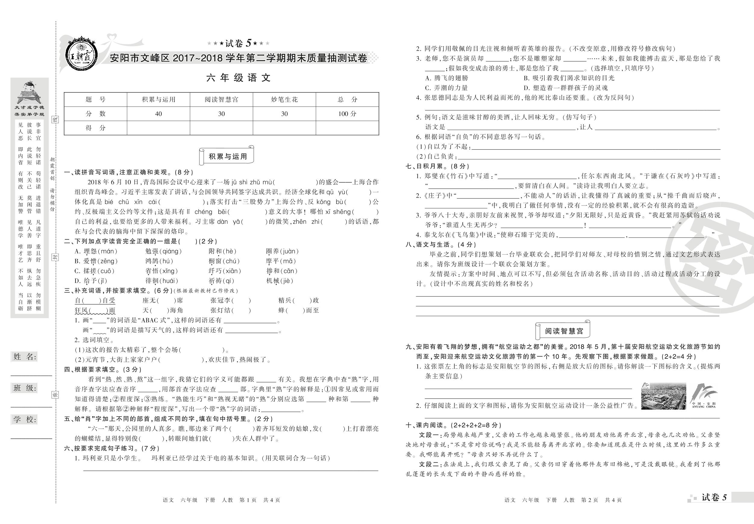 2017-2018学年第二学期安阳市文峰区六年级语文试卷(人教版)【5】