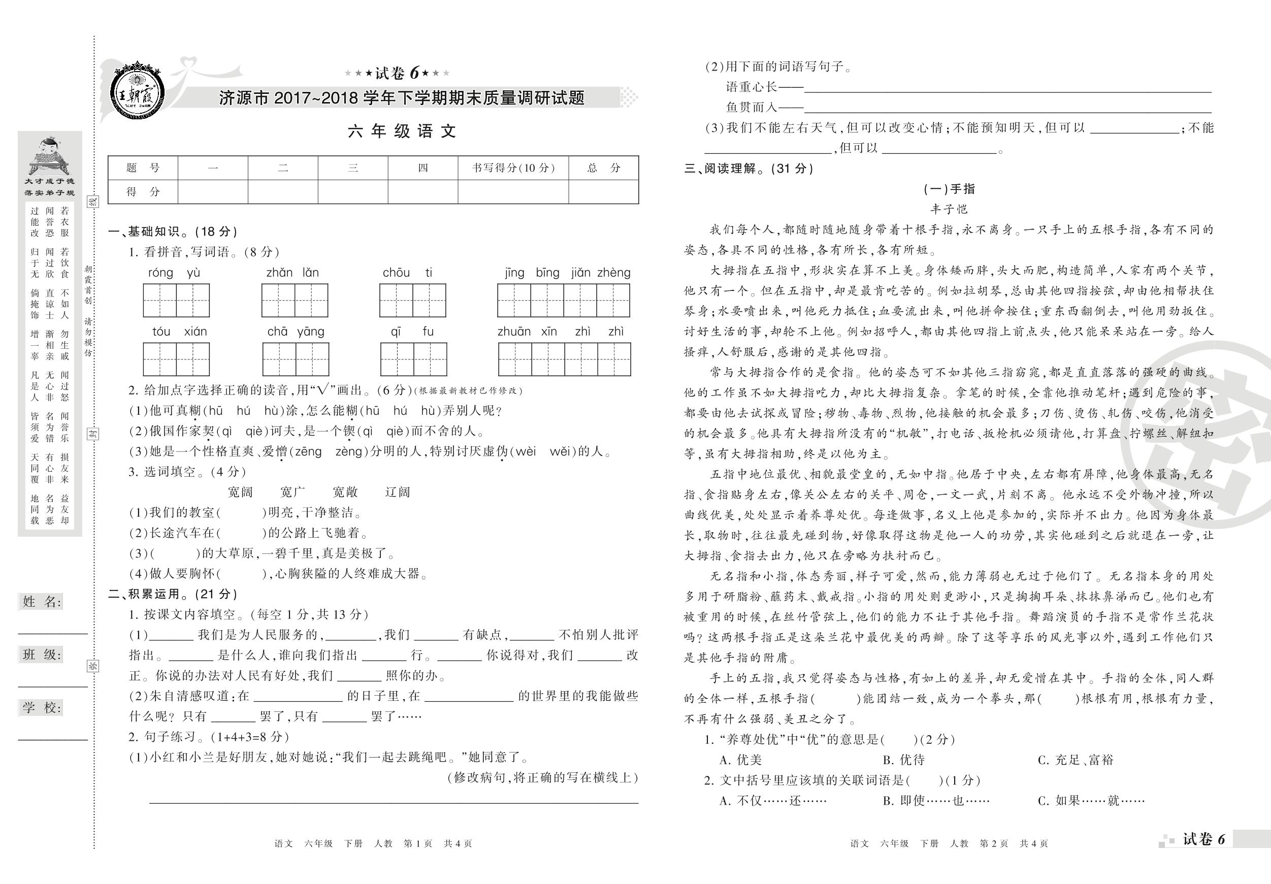 2017-2018学年第二学期济源市六年级语文试卷(人教版)【6】