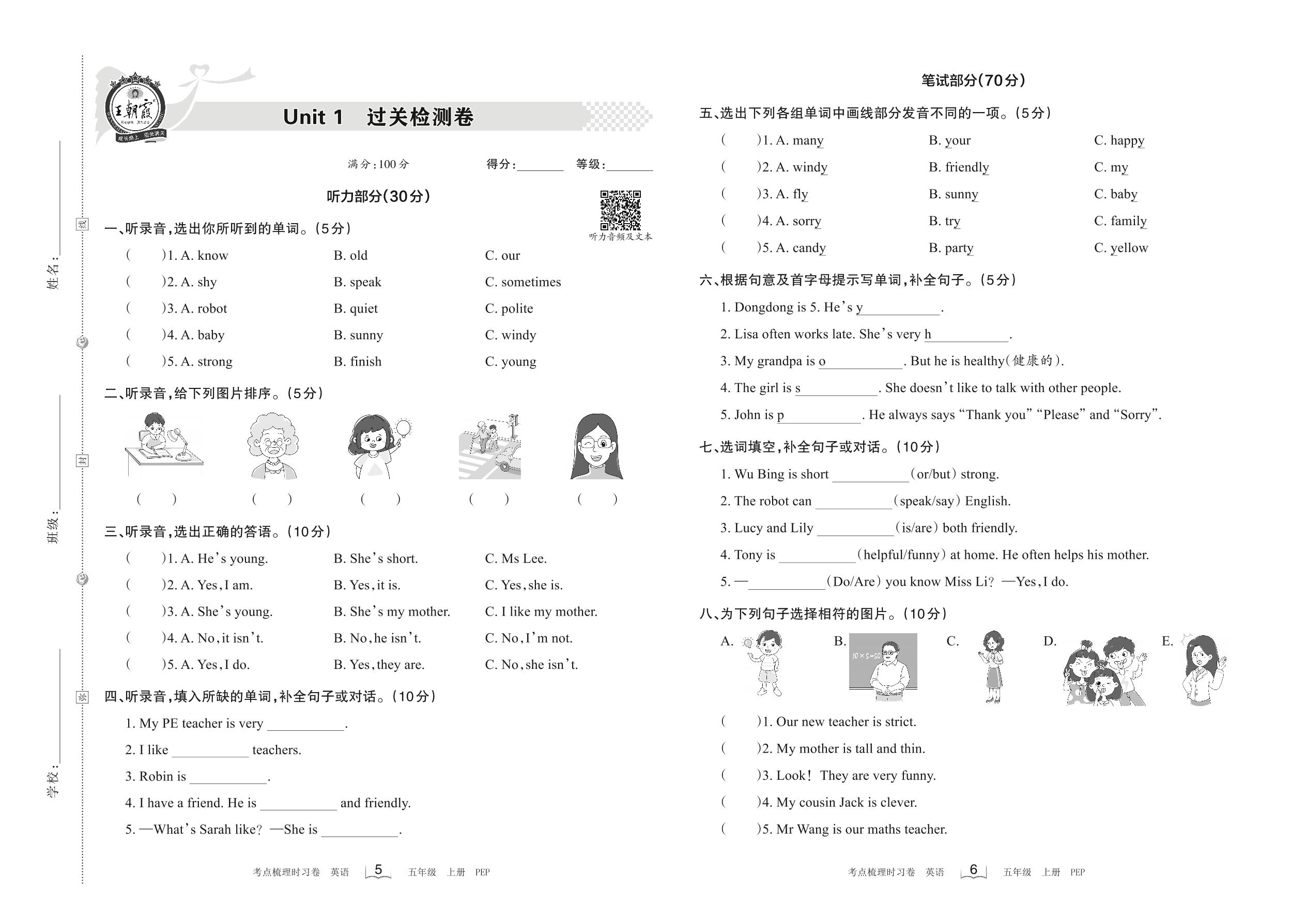 2022上册五年级英语人教PEP版 Unit 1 过关检测卷