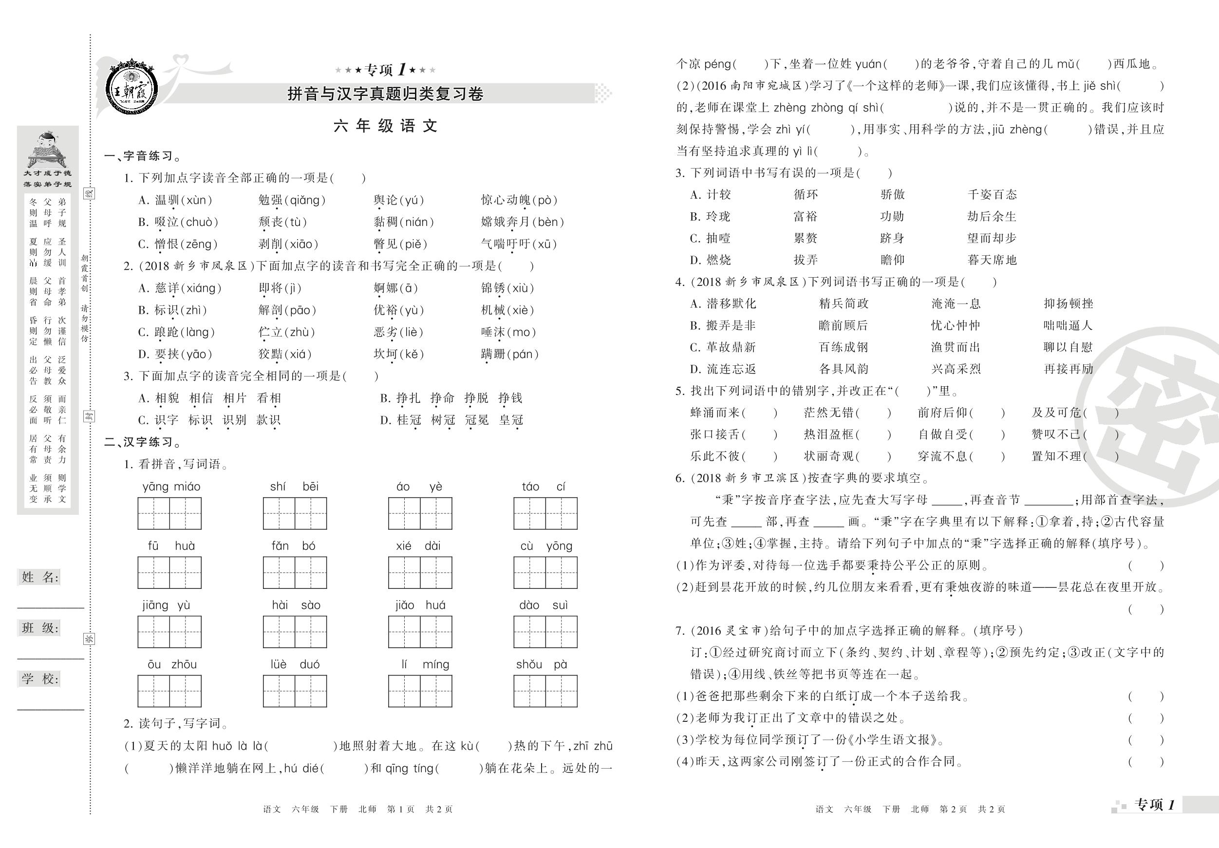 王朝霞期末专项卷——拼音与汉字、词语真题归类复习卷六年级下册语文(北师版)_R21080243206【0】