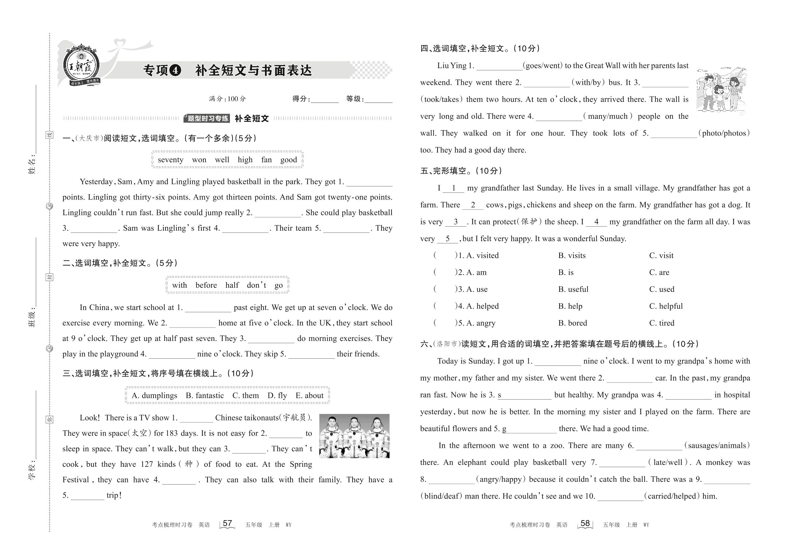 2022上册五年级英语外研版 专项4 补全短文与书面表达