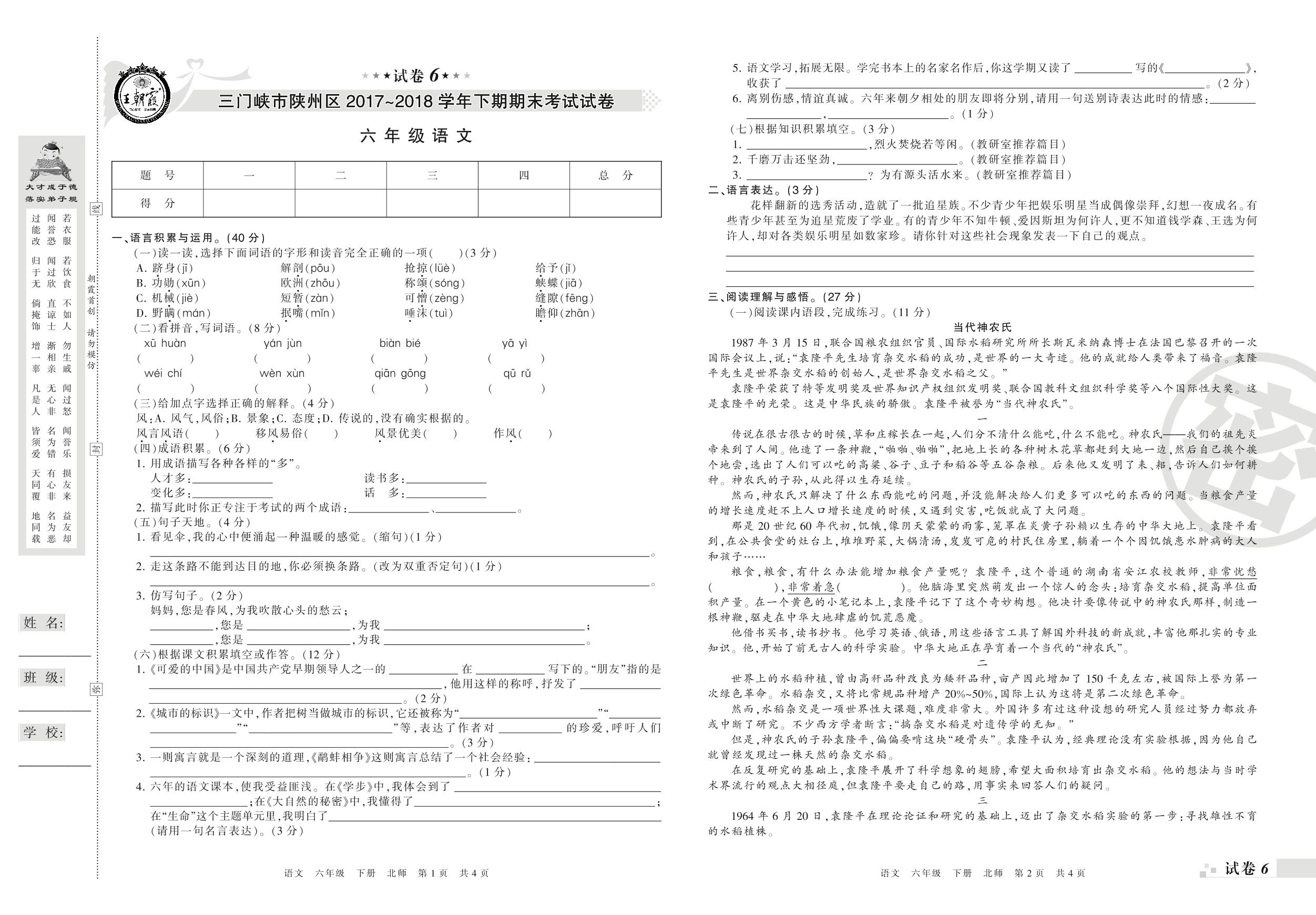 2017-2018学年第二学期三门峡市陕州区六年级语文试卷(北师版)【6】