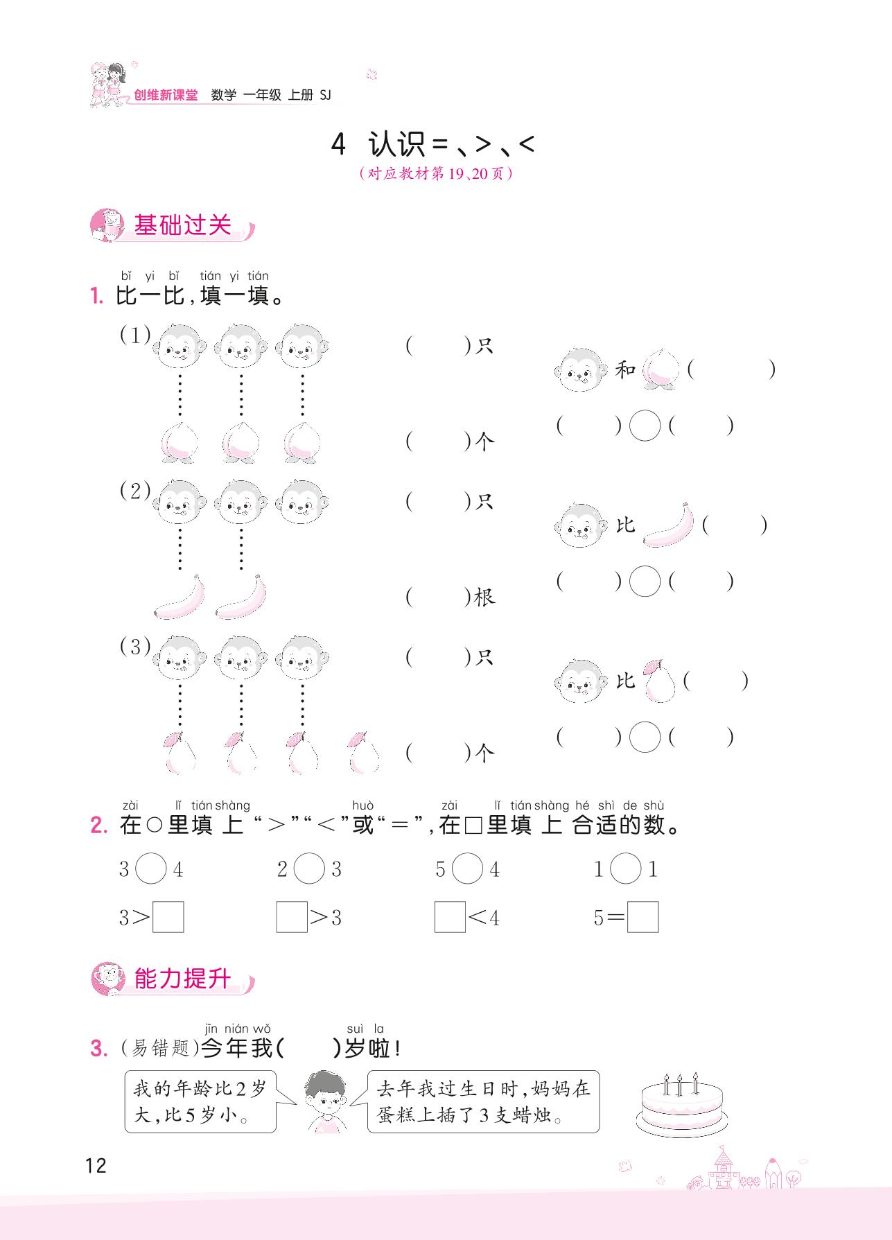 2022上册一年级数学苏教版 五 认识10以内的数——4 认识=、>、<