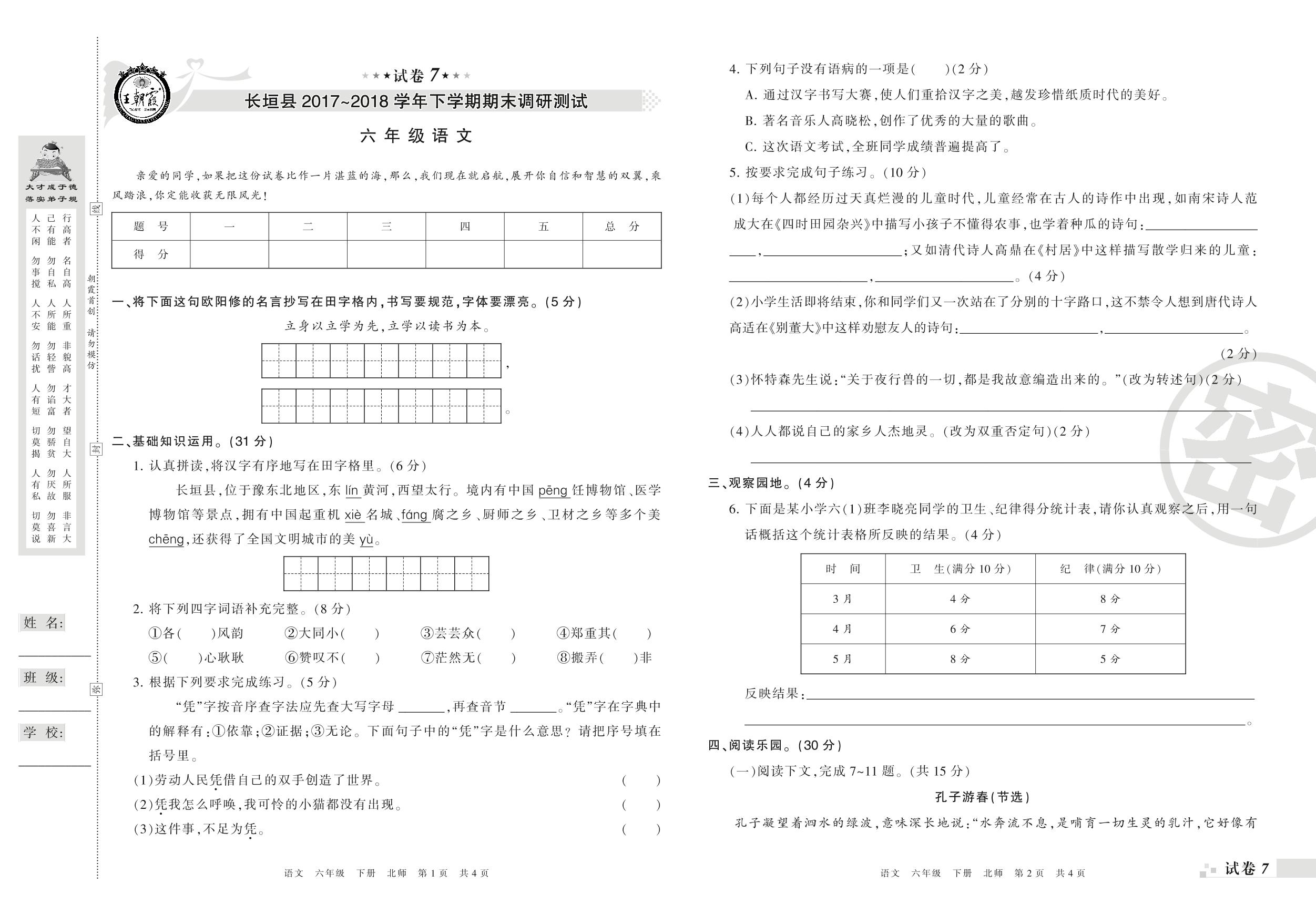 2017-2018学年第二学期新乡市长垣县六年级语文试卷(北师版)【7】