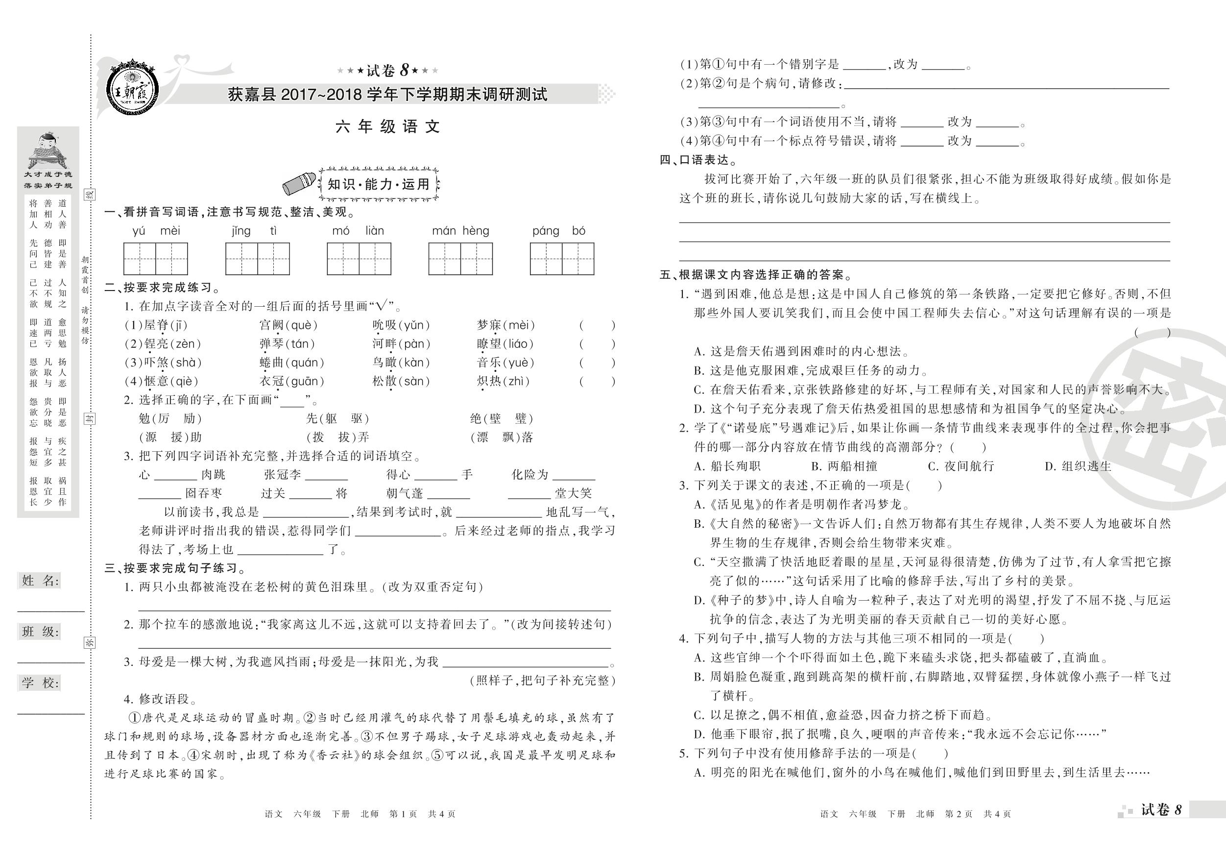 2017-2018学年第二学期新乡市获嘉县六年级语文试卷(北师版)【8】