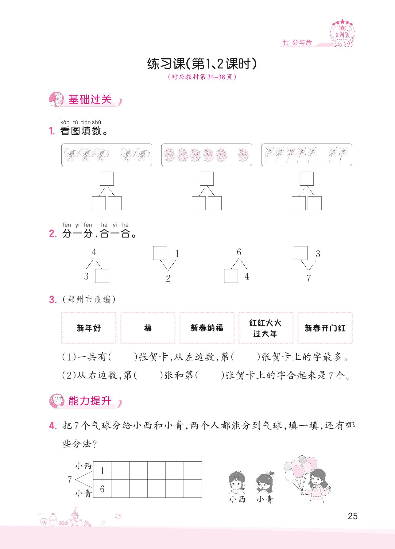 2022上册一年级数学苏教版 七 分与合——练习课(第1、2课时)