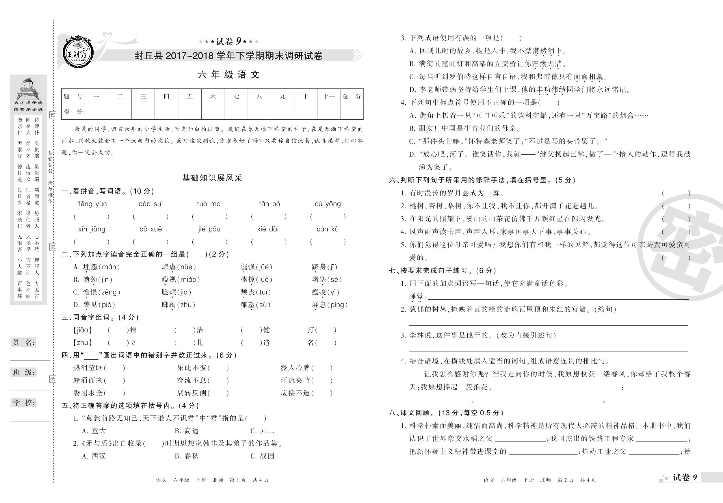 2017-2018学年第二学期新乡市封丘县六年级语文试卷(北师版)【9】