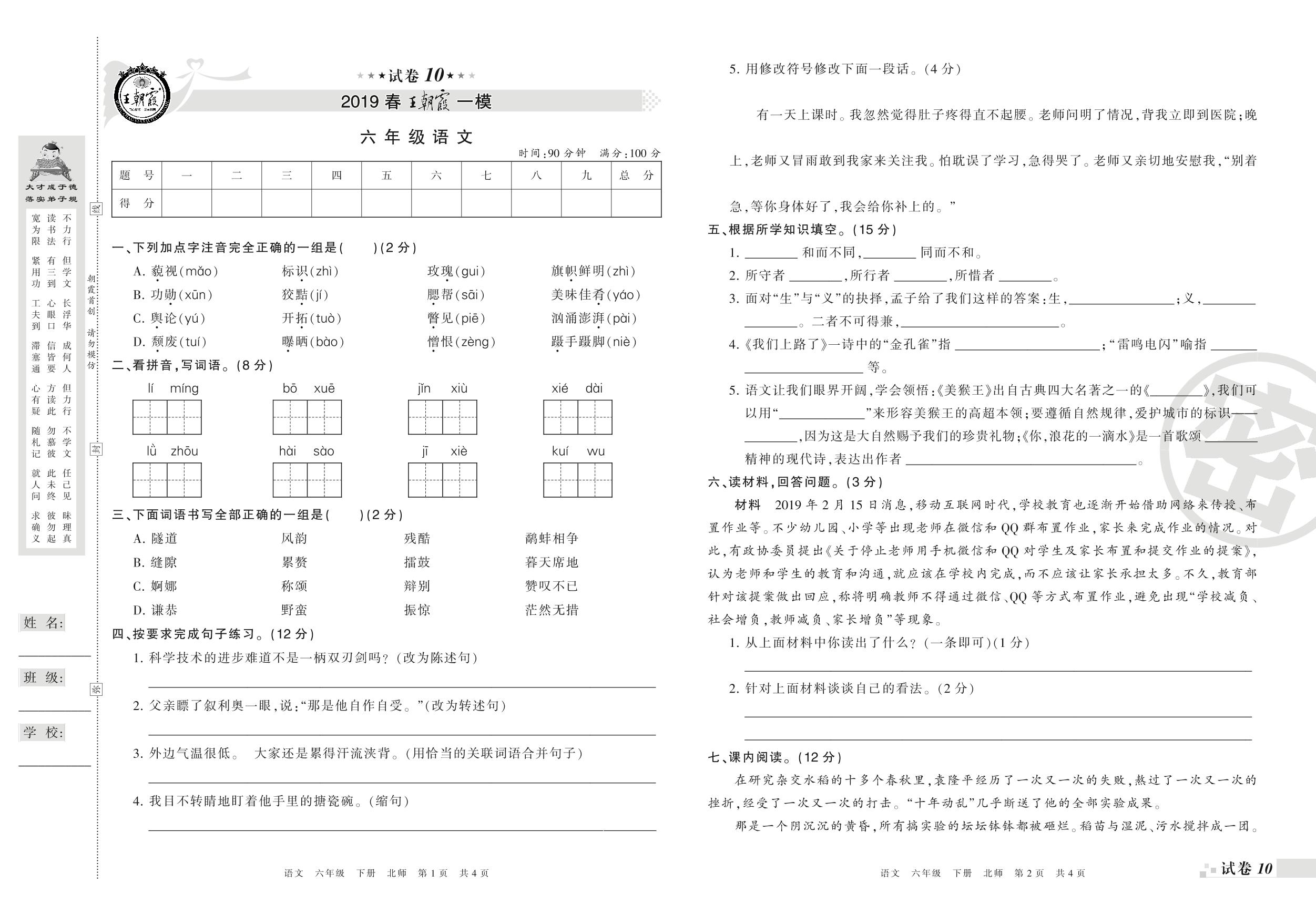 王朝霞期末模拟卷六年级下册语文(北师版)【10】