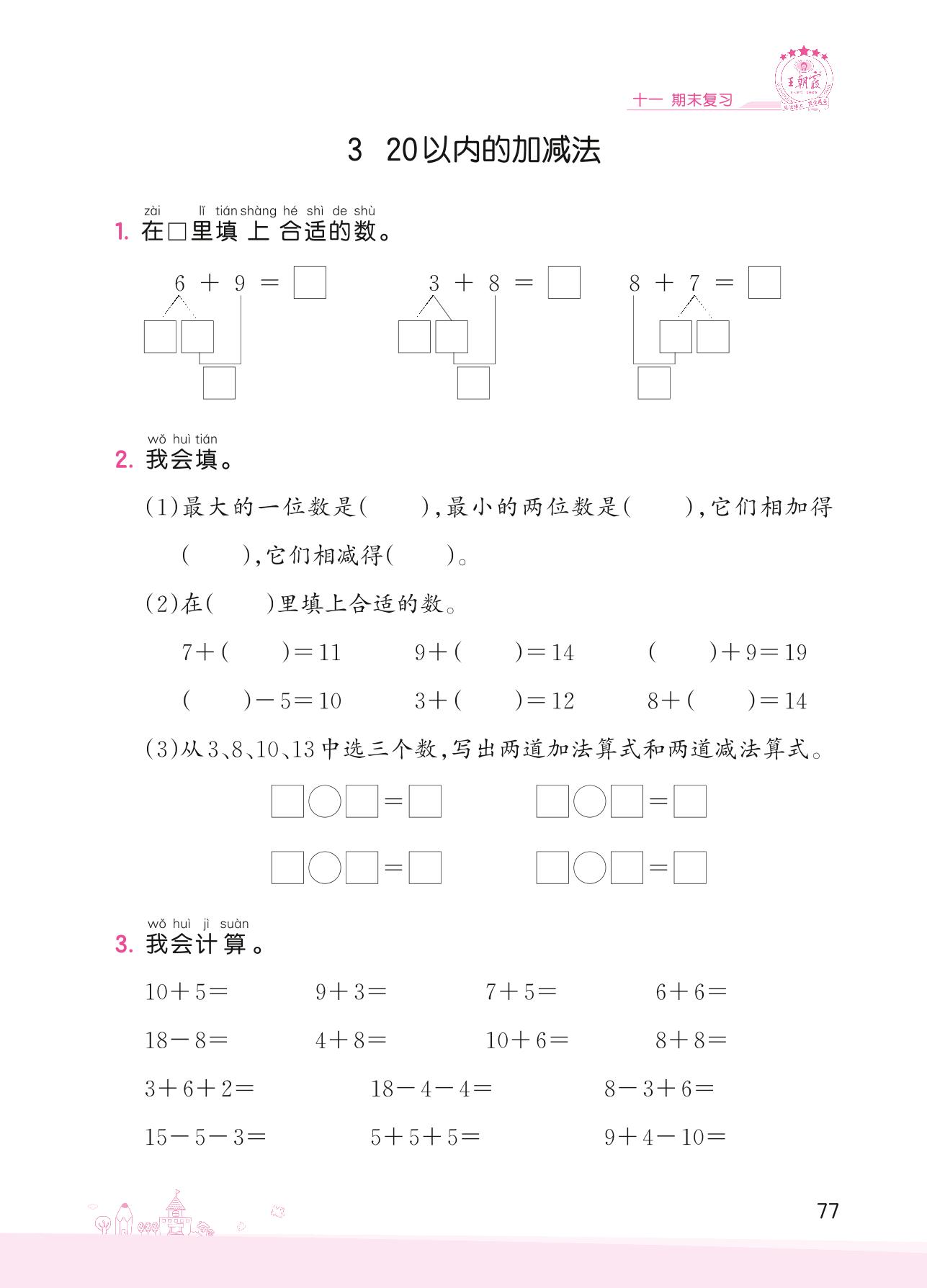 2022上册一年级数学苏教版 十一 期末复习——3 20以内的加减法