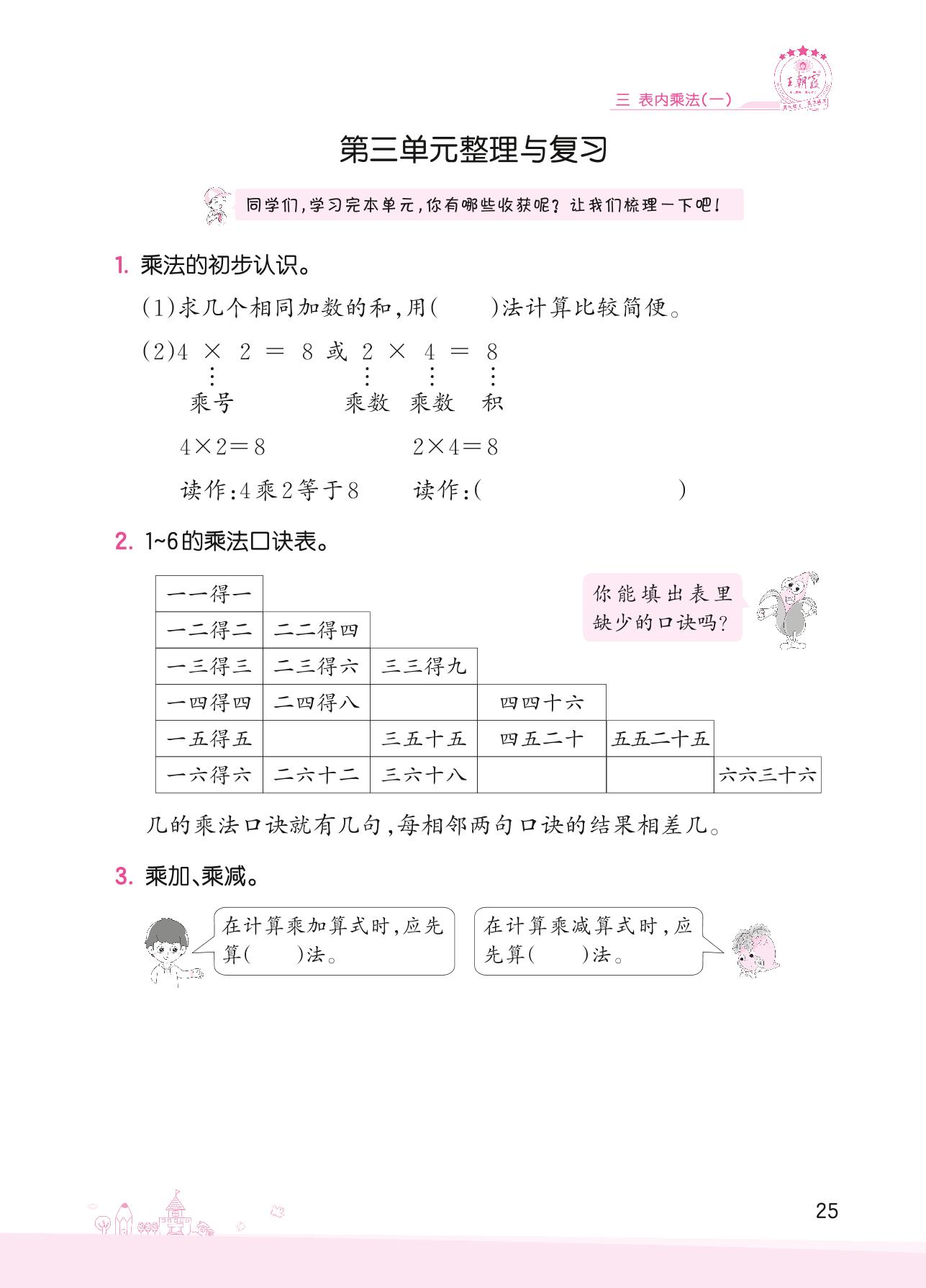 2022上册二年级数学苏教版 三 表内乘法(一)——第三单元整理与复习