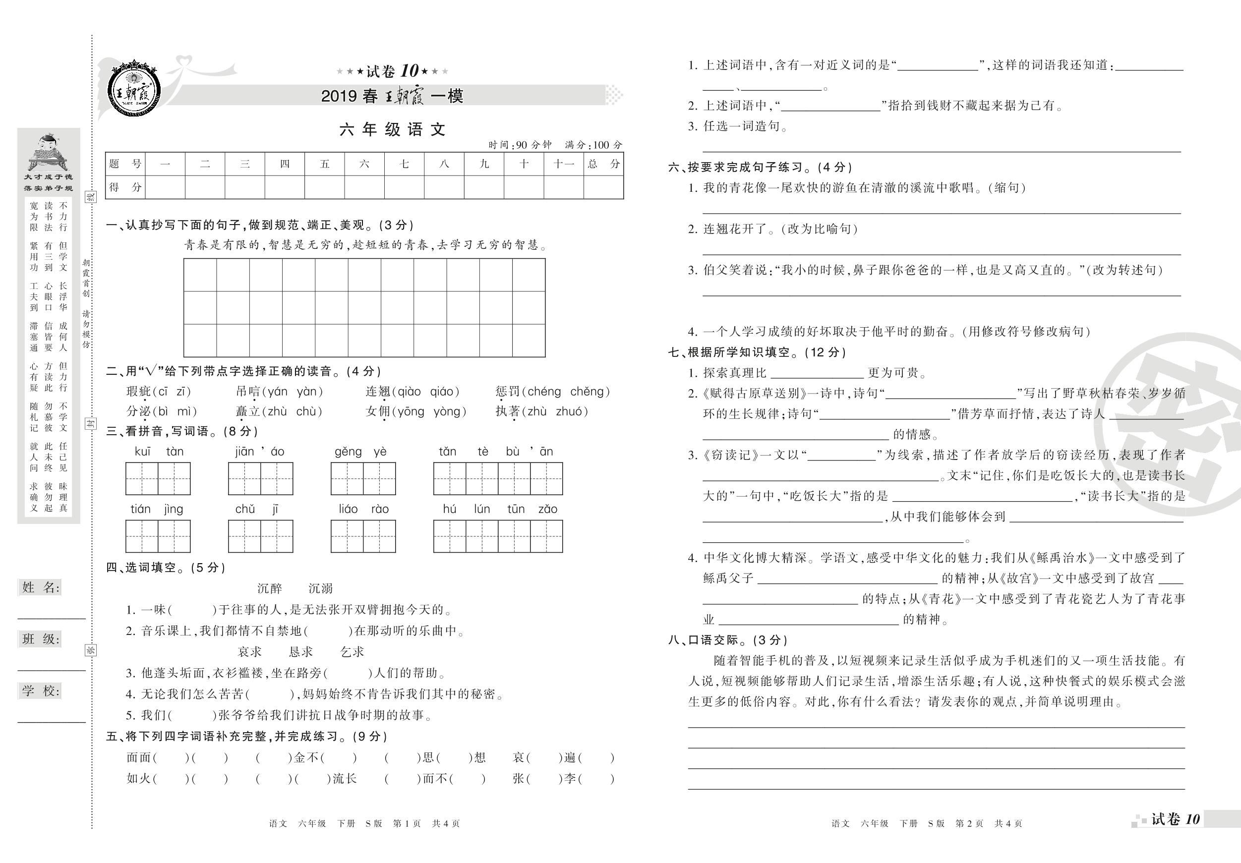 王朝霞期末模拟卷六年级下册语文(S版)_R21080243323【10】