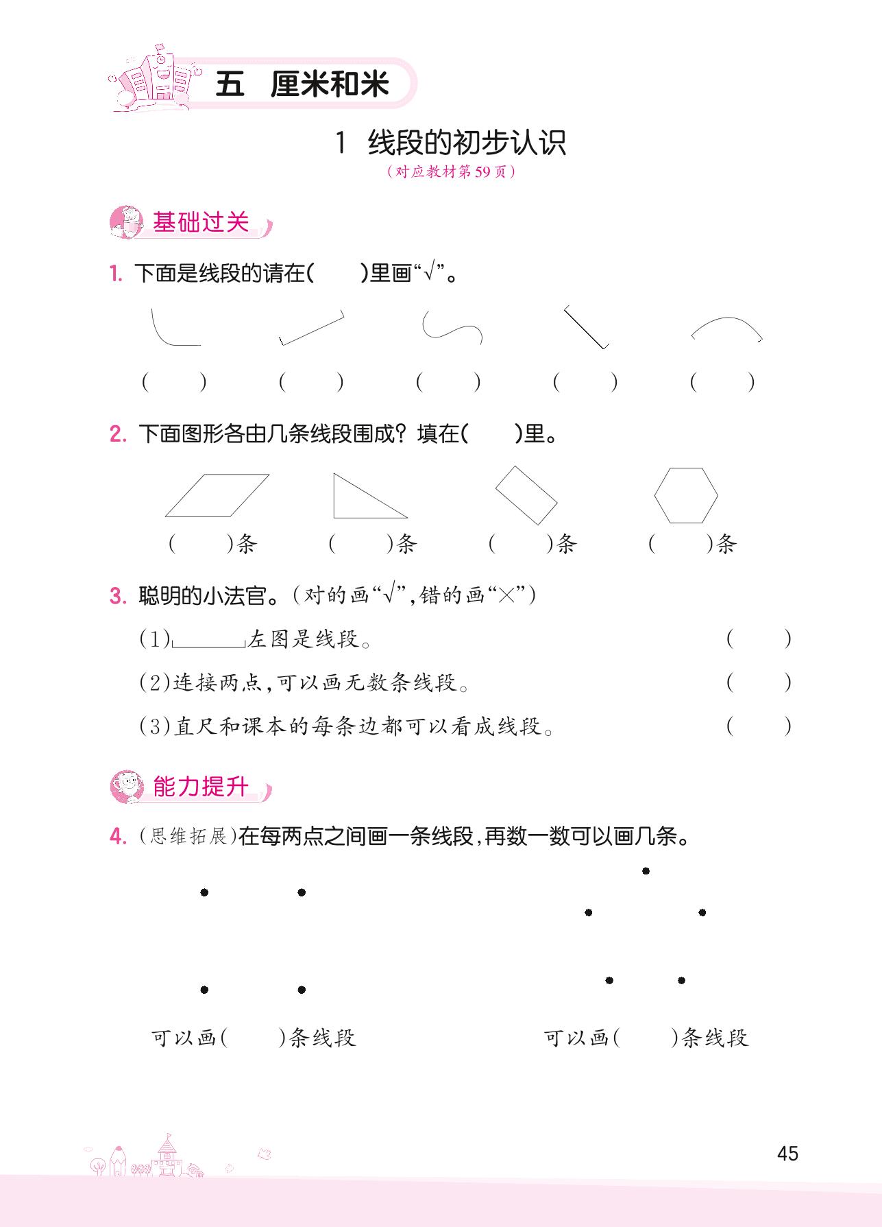 2022上册二年级数学苏教版 五 厘米和米——1 线段的初步认识