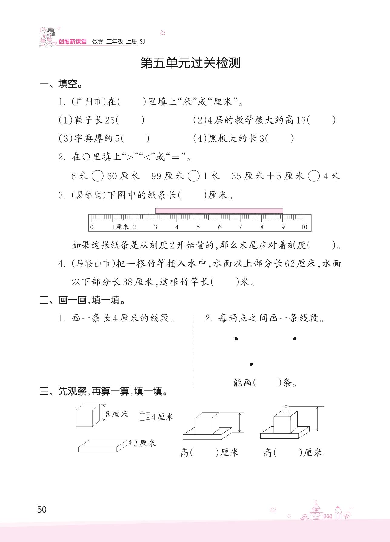 2022上册二年级数学苏教版 五 厘米和米——第五单元过关检测