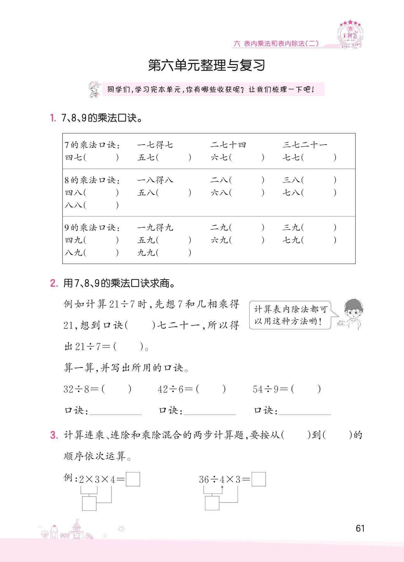 2022上册二年级数学苏教版 六 表内乘法和表内除法(二)——第六单元整理与复习