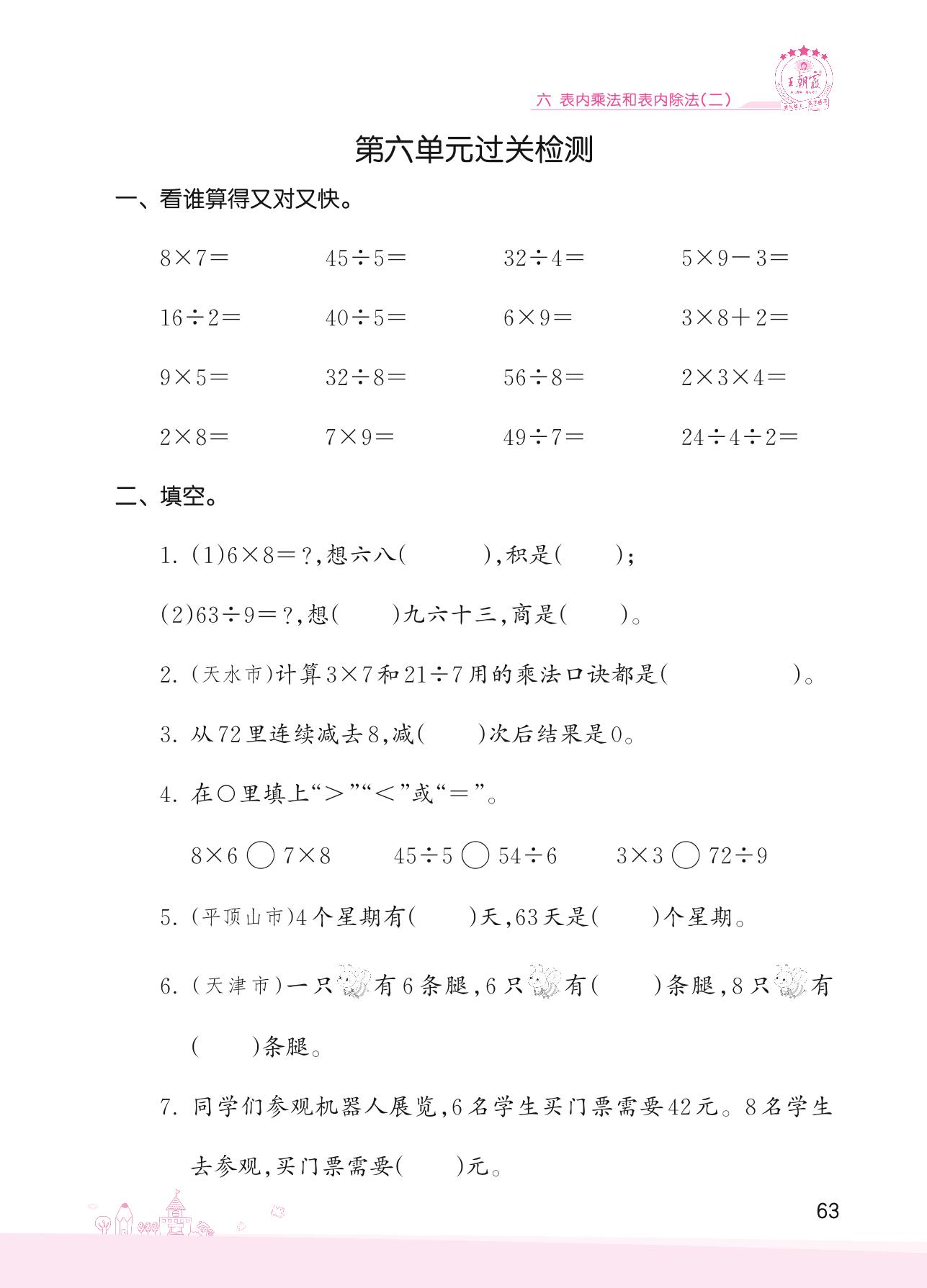 2022上册二年级数学苏教版 六 表内乘法和表内除法(二)——第六单元过关检测