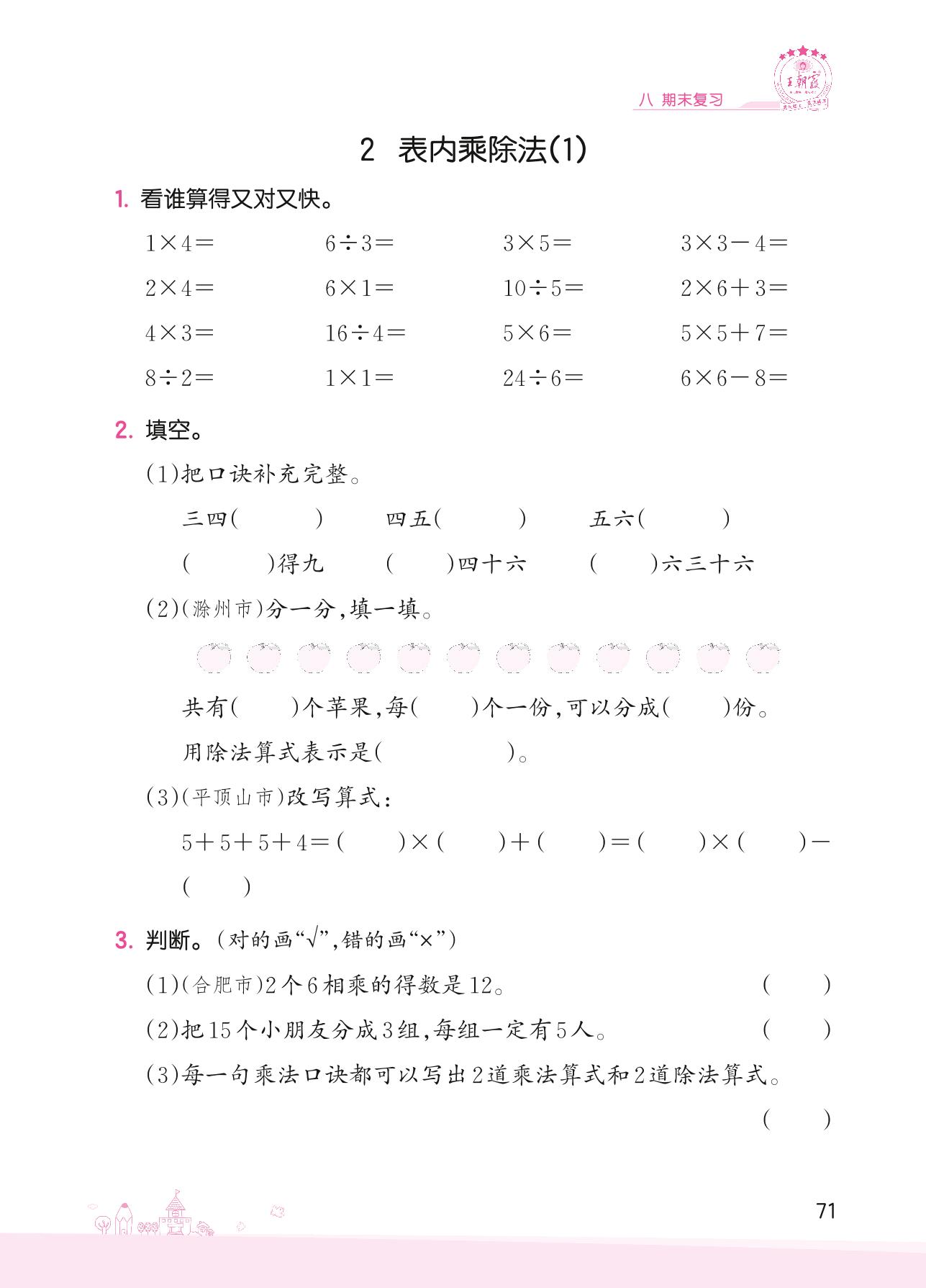 2022上册二年级数学苏教版 八 期末复习——2 表内乘除法(1)