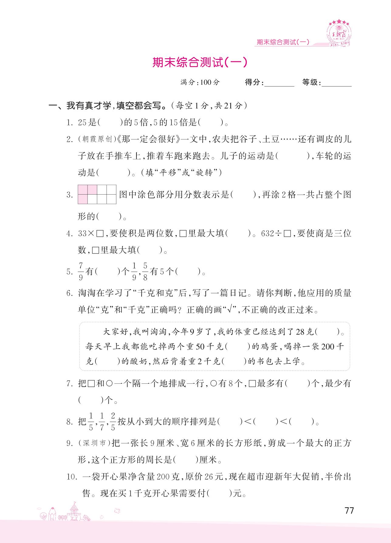 2022上册三年级数学苏教版 期末综合测试(一)