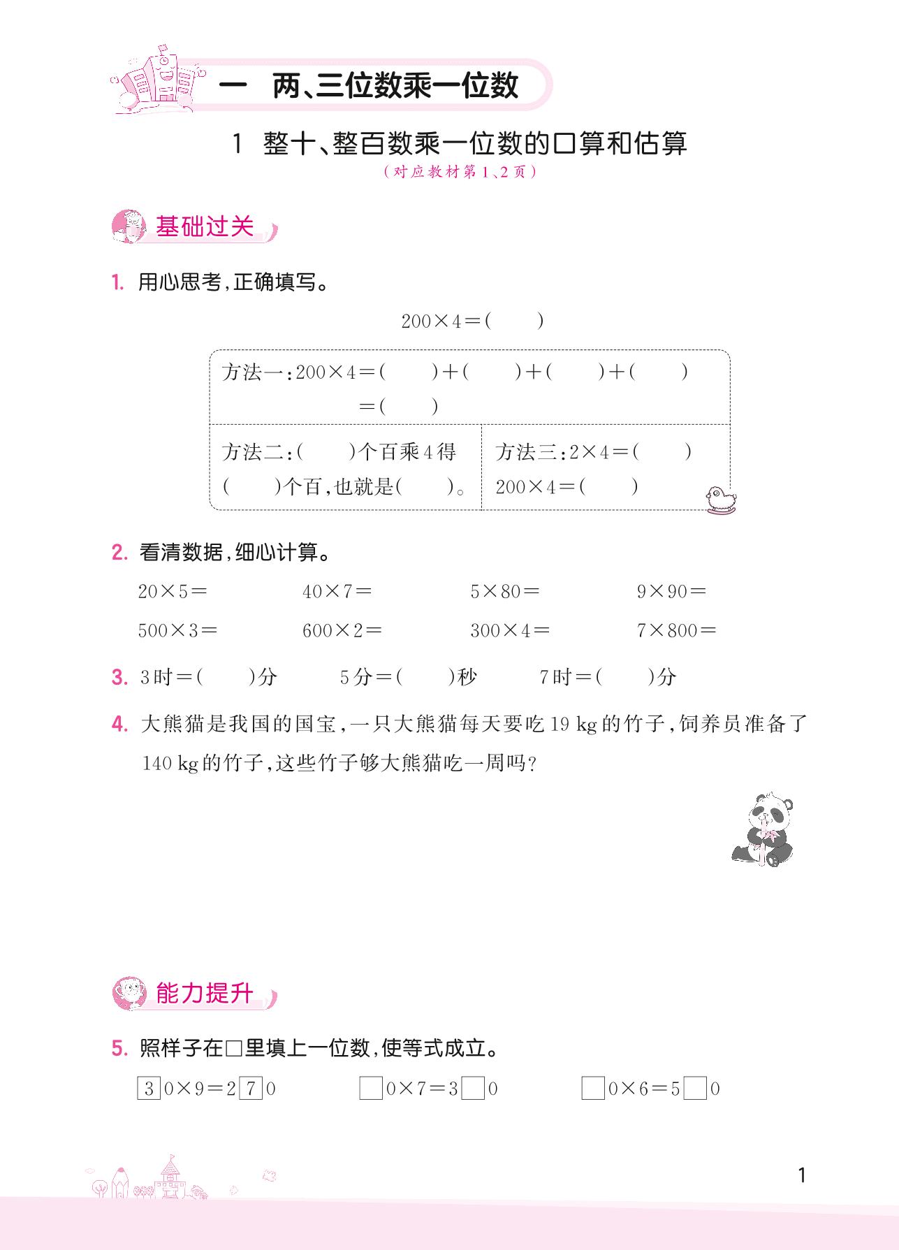 2022上册三年级数学苏教版 一 两、三位数乘一位数——1 整十、整百数乘一位数的口算和估算