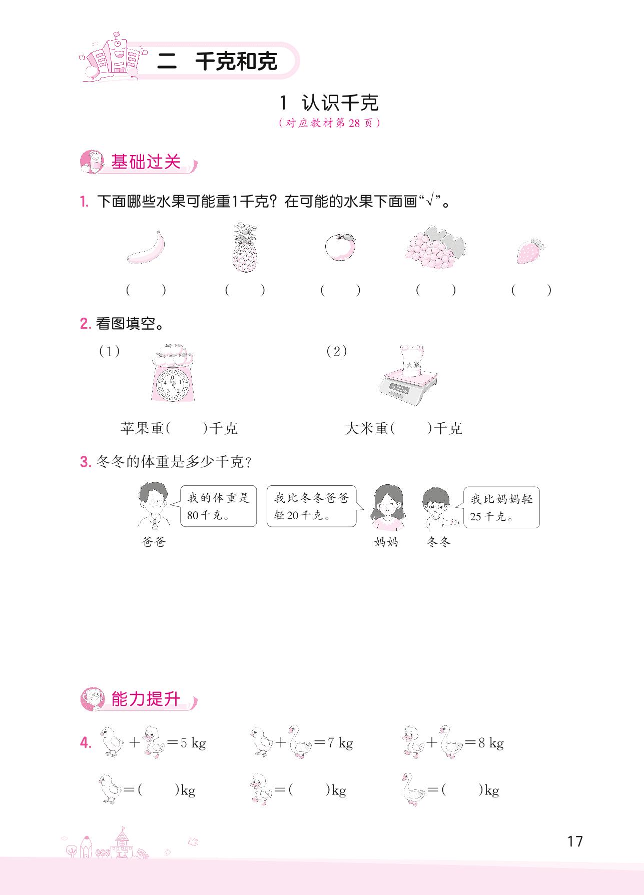 2022上册三年级数学苏教版 二 千克和克——1 认识千克
