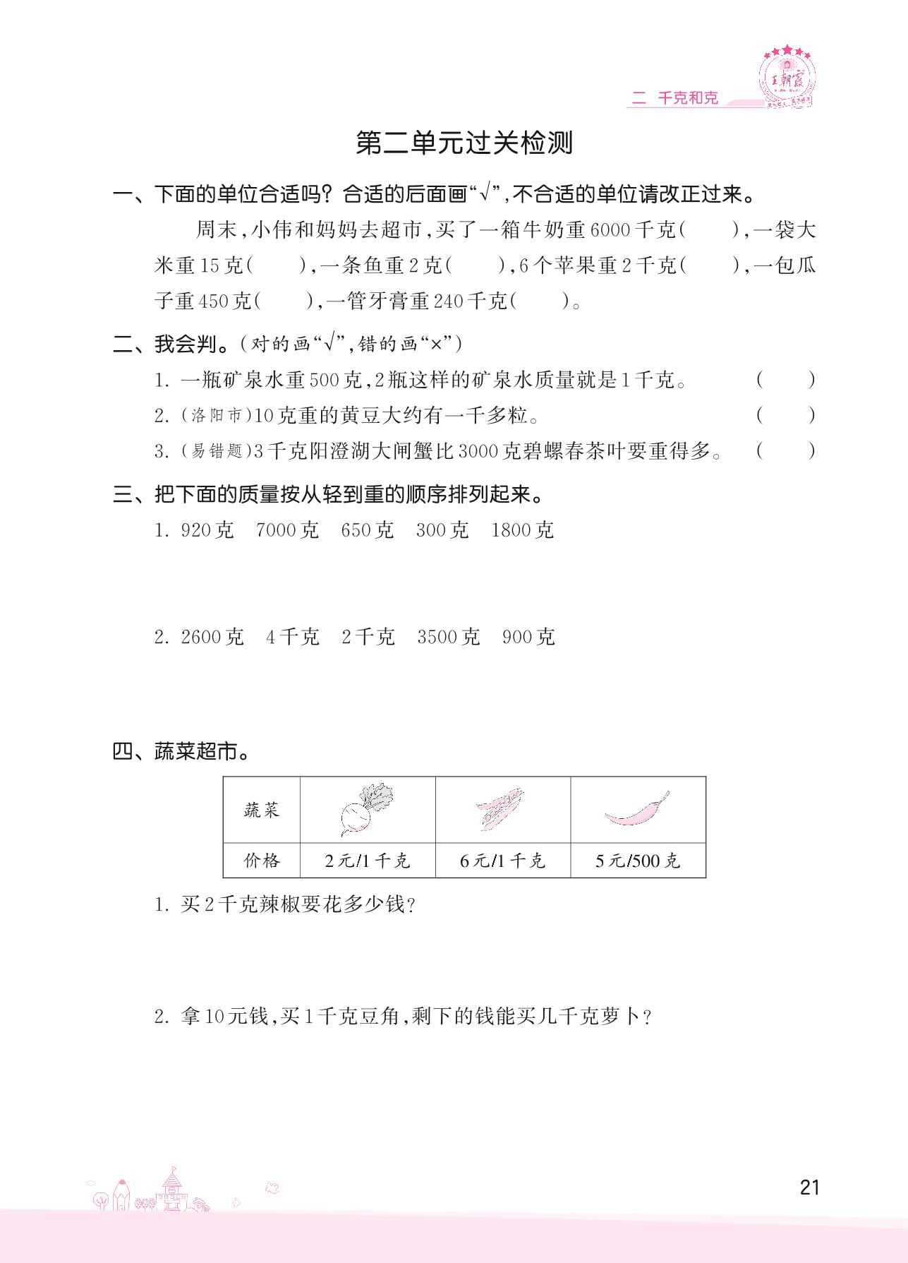 2022上册三年级数学苏教版 二 千克和克——第二单元过关检测