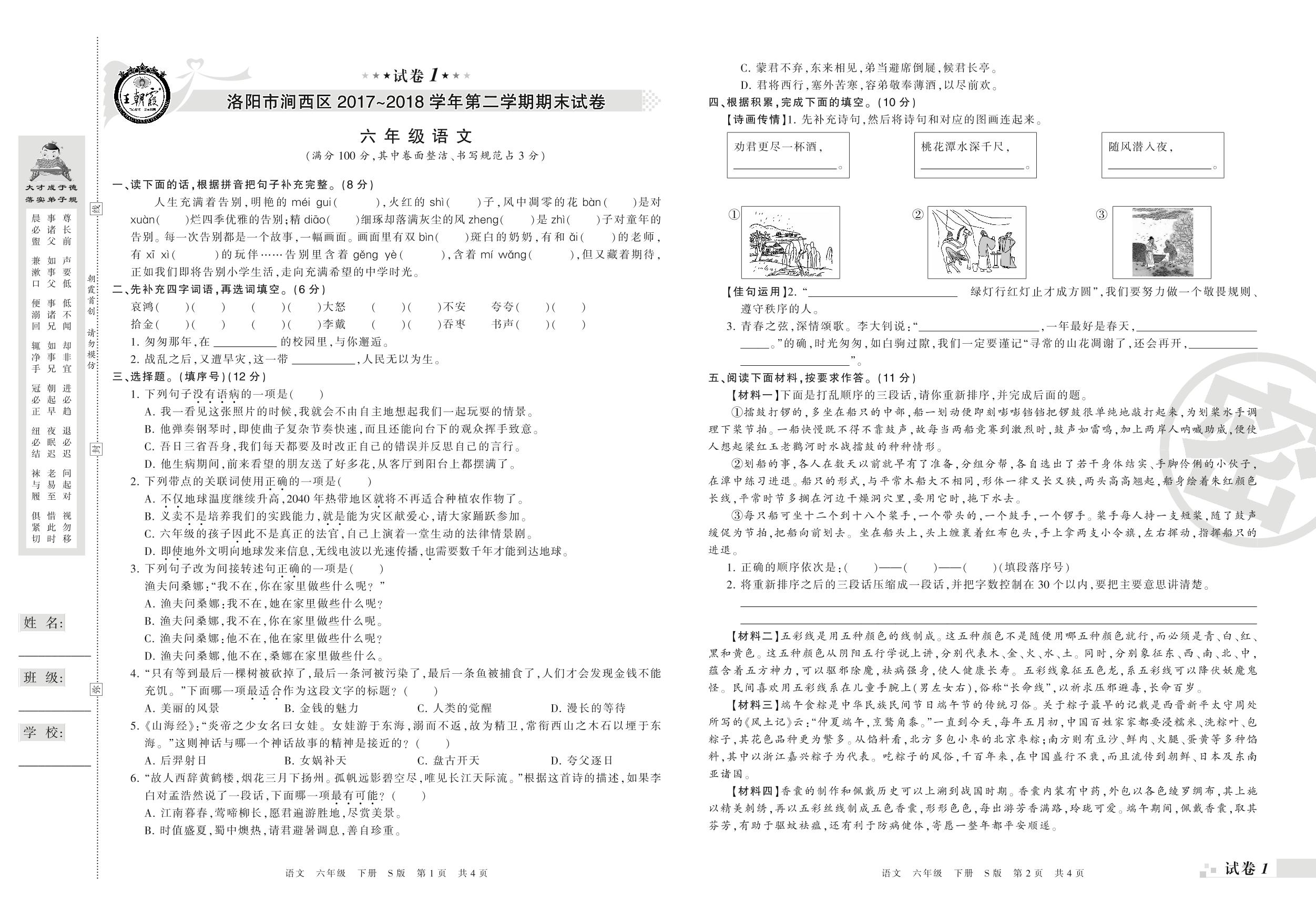 2017-2018学年第二学期洛阳市涧西区六年级语文试卷(S版)_R21080243348【1】
