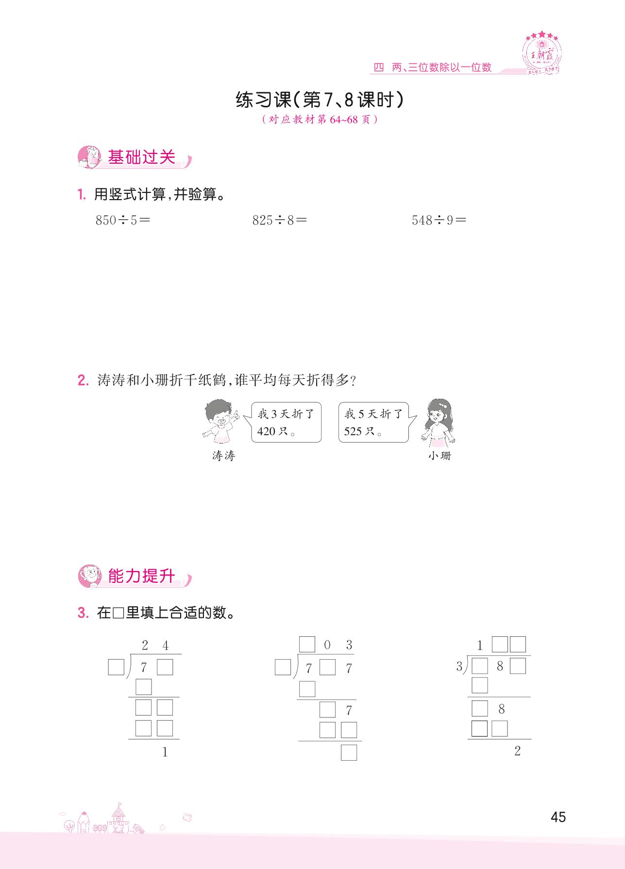 2022上册三年级数学苏教版 四 两、三位数除以一位数——练习课(第7、8课时)