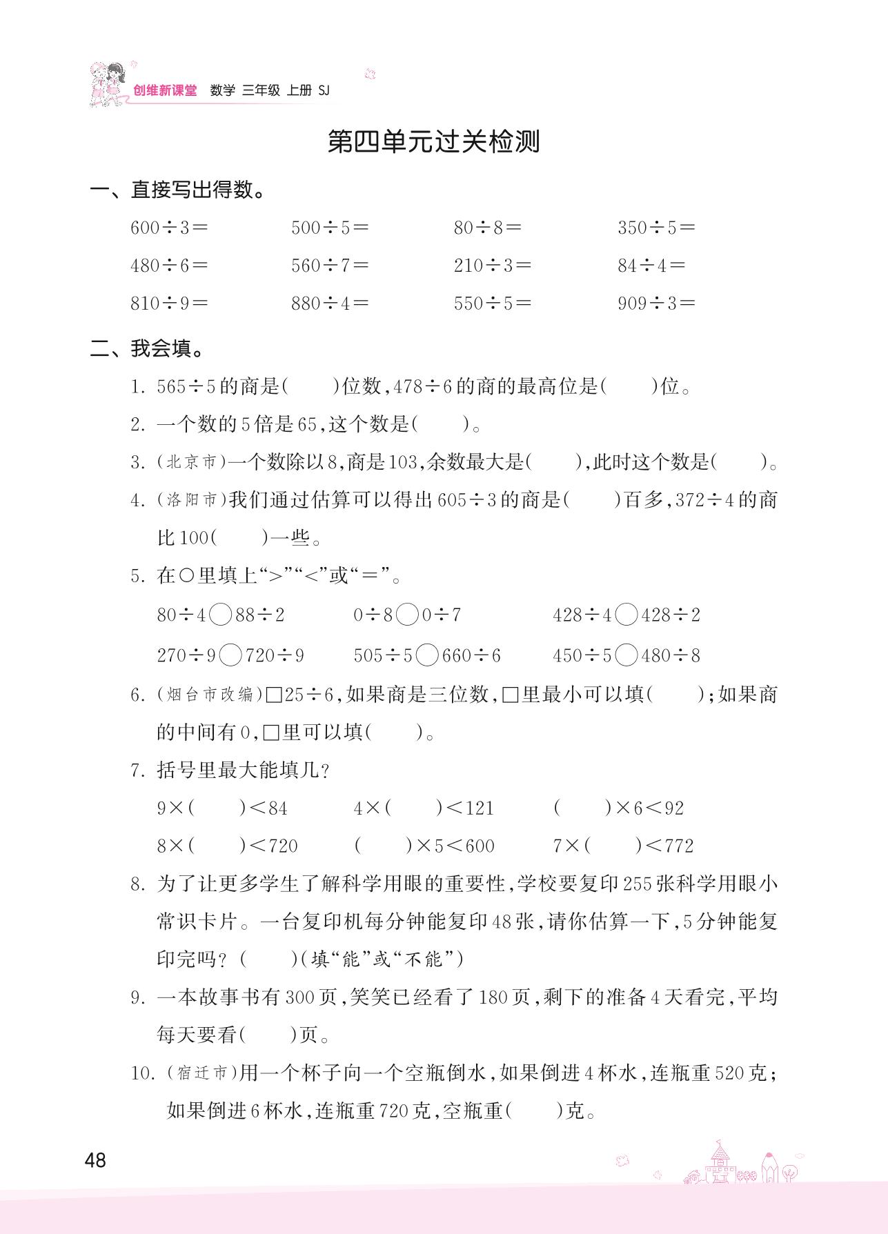 2022上册三年级数学苏教版 四 两、三位数除以一位数——第四单元过关检测